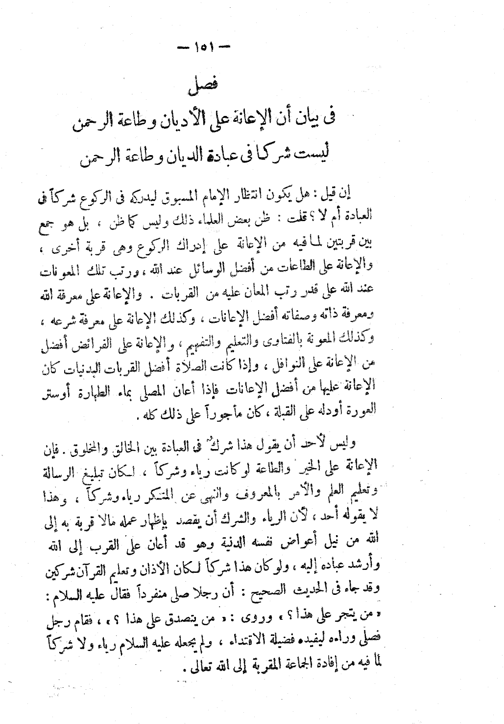 فِي عِبَادَةِ الدَّيَّانِ وَطَاعَةِ الرَّحْمَنِ إنْ قِيلَ: هَلْ يَكُونُ انْتِظَارُ الْإِمَامِ الْمَسْبُوقِ لِيُدْرِكَهُ فِي الرُّكُوعِ شِرْكًا فِي الْعِبَادَةِ أَمْ لَا؟ قُلْت: ظَنَّ بَعْضُ الْعُلَمَاءِ ذَلِكَ وَلَيْسَ كَمَا ظَنَّ، بَلْ هُوَ جَمْعٌ بَيْنَ قُرْبَتَيْنِ لِمَا فِيهِ مِنْ الْإِعَانَةِ عَلَى إدْرَاكِ الرُّكُوعِ وَهِيَ قُرْبَةٌ أُخْرَى، وَالْإِعَانَةُ عَلَى الطَّاعَاتِ مِنْ أَفْضَلِ الْوَسَائِلِ عِنْدَ اللَّهِ، وَرُتَبُ تِلْكَ الْمَعُونَاتِ عِنْدَ اللَّهِ عَلَى قَدْرِ رُتَبِ الْمُعَانِ عَلَيْهِ مِنْ الْقُرُبَاتِ. وَالْإِعَانَةُ عَلَى مَعْرِفَةِ اللَّهِ وَمَعْرِفَةِ ذَاتِهِ وَصِفَاتِهِ أَفْضَلُ الْإِعَانَاتِ.