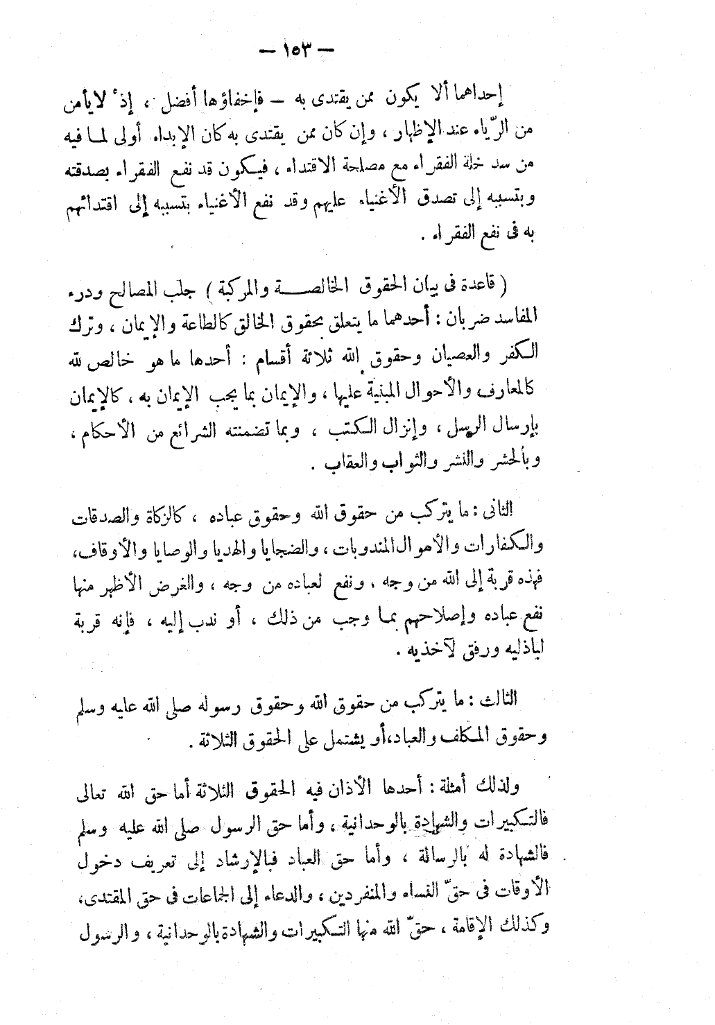 (قَاعِدَةٌ فِي بَيَانِ الْحُقُوقِ الْخَالِصَةِ وَالْمُرَكَّبَةِ) جَلْبُ الْمَصَالِحِ وَدَرْءُ الْمَفَاسِدِ ضَرْبَانِ: أَحَدُهُمَا مَا يَتَعَلَّقُ بِحُقُوقِ الْخَالِقِ كَالطَّاعَةِ وَالْإِيمَانِ، وَتَرْكِ الْكُفْرِ وَالْعِصْيَانِ وَحُقُوقُ اللَّهِ ثَلَاثَةُ أَقْسَامٍ: أَحَدُهَا مَا هُوَ خَالِصٌ لِلَّهِ كَالْمَعَارِفِ وَالْأَحْوَالِ الْمَبْنِيَّةِ عَلَيْهَا، وَالْإِيمَانِ بِمَا يَجِبُ الْإِيمَانُ بِهِ، كَالْإِيمَانِ بِإِرْسَالِ الرُّسُلِ، وَإِنْزَالِ الْكُتُبِ، وَبِمَا تَضَمَّنَتْهُ الشَّرَائِعُ مِنْ الْأَحْكَامِ، وَبِالْحَشْرِ وَالنَّشْرِ وَالثَّوَابِ وَالْعِقَابِ.