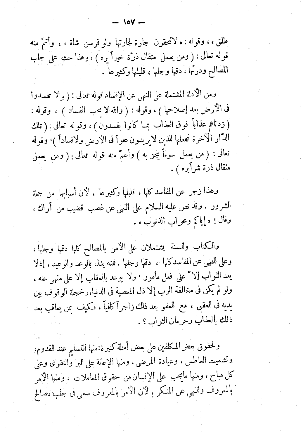 طَلْقٍ» ، وَقَوْلُهُ: «لَا تَحْقِرَنَّ جَارَةٌ لِجَارَتِهَا وَلَوْ فِرْسِنَ شَاةٍ» ، وَأَتَمُّ مِنْهُ قَوْله تَعَالَى {فَمَنْ يَعْمَلْ مِثْقَالَ ذَرَّةٍ خَيْرًا يَرَهُ} [الزلزلة: 7] ، وَهَذَا حَثٌّ عَلَى جَلْبِ الْمَصَالِحِ وَدَرْئِهَا، دَقِّهَا وَجَلِّهَا، قَلِيلِهَا وَكَثِيرِهَا. وَمِنْ الْأَدِلَّةِ الْمُشْتَمِلَةِ عَلَى النَّهْيِ عَنْ الْإِفْسَادِ قَوْله تَعَالَى {وَلا تُفْسِدُوا فِي الأَرْضِ بَعْدَ إِصْلاحِهَا} [الأعراف: 56] ، وَقَوْلُهُ: {وَاللَّهُ لا يُحِبُّ الْفَسَادَ} [البقرة: 205] ، وَقَوْلُهُ: {زِدْنَاهُمْ عَذَابًا فَوْقَ الْعَذَابِ بِمَا كَانُوا يُفْسِدُونَ} [النحل: 88] ، وقَوْله تَعَالَى: {تِلْكَ الدَّارُ الآخِرَةُ نَجْعَلُهَا لِلَّذِينَ لا يُرِيدُونَ عُلُوًّا فِي الأَرْضِ وَلا فَسَادًا} [القصص: 83] ، وقَوْله تَعَالَى {مَنْ يَعْمَلْ سُوءًا يُجْزَ بِهِ} [النساء: 123] وَأَعَمُّ مِنْهُ قَوْله تَعَالَى: {وَمَنْ يَعْمَلْ مِثْقَالَ ذَرَّةٍ شَرًّا يَرَهُ} [الزلزلة: 8] . وَهَذَا زَجْرٌ عَنْ الْمَفَاسِدِ كُلِّهَا، قَلِيلِهَا وَكَثِيرِهَا، لِأَنَّ أَسْبَابَهَا مِنْ جُمْلَةِ الشُّرُورِ. وَقَدْ نَصَّ - عَلَيْهِ السَّلَامُ - عَلَى النَّهْيِ عَنْ غَصْبِ قَضِيبٍ مِنْ أَرَاك، وَقَالَ، «إيَّاكُمْ وَمِحْرَابَ الذُّنُوبِ» . وَالْكِتَابُ وَالسُّنَّةُ يَشْتَمِلَانِ عَلَى الْأَمْرِ بِالْمَصَالِحِ كُلِّهَا دَقِّهَا وَجُلِّهَا، وَعَلَى النَّهْيِ عَنْ الْمَفَاسِدِ كُلِّهَا، دَقِّهَا وَجَلِّهَا. فَمِنْهُ يَدُلُّ بِالْوَعْدِ وَالْوَعِيدِ، إذْ لَا يَعِدُ الثَّوَابَ إلَّا عَلَى فِعْلِ مَأْمُورٍ، وَلَا يُوعِدُ بِالْعِقَابِ إلَّا عَلَى مَنْهِيٍّ عَنْهُ، وَلَوْ لَمْ يَكُنْ فِي مُخَالَفَةِ الرَّبِّ إلَّا ذُلُّ الْمَعْصِيَةِ فِي الدُّنْيَا، وَخَجِلَةُ الْوُقُوفِ بَيْنَ يَدَيْهِ فِي الْعُقْبَى، مَعَ الْعَفْوِ بَعْدَ ذَلِكَ زَاجِرًا كَافِيًا، فَكَيْفَ بِمَنْ يُعَاقَبُ بَعْدَ ذَلِكَ بِالْعَذَابِ وَحِرْمَانِ الثَّوَابِ؟