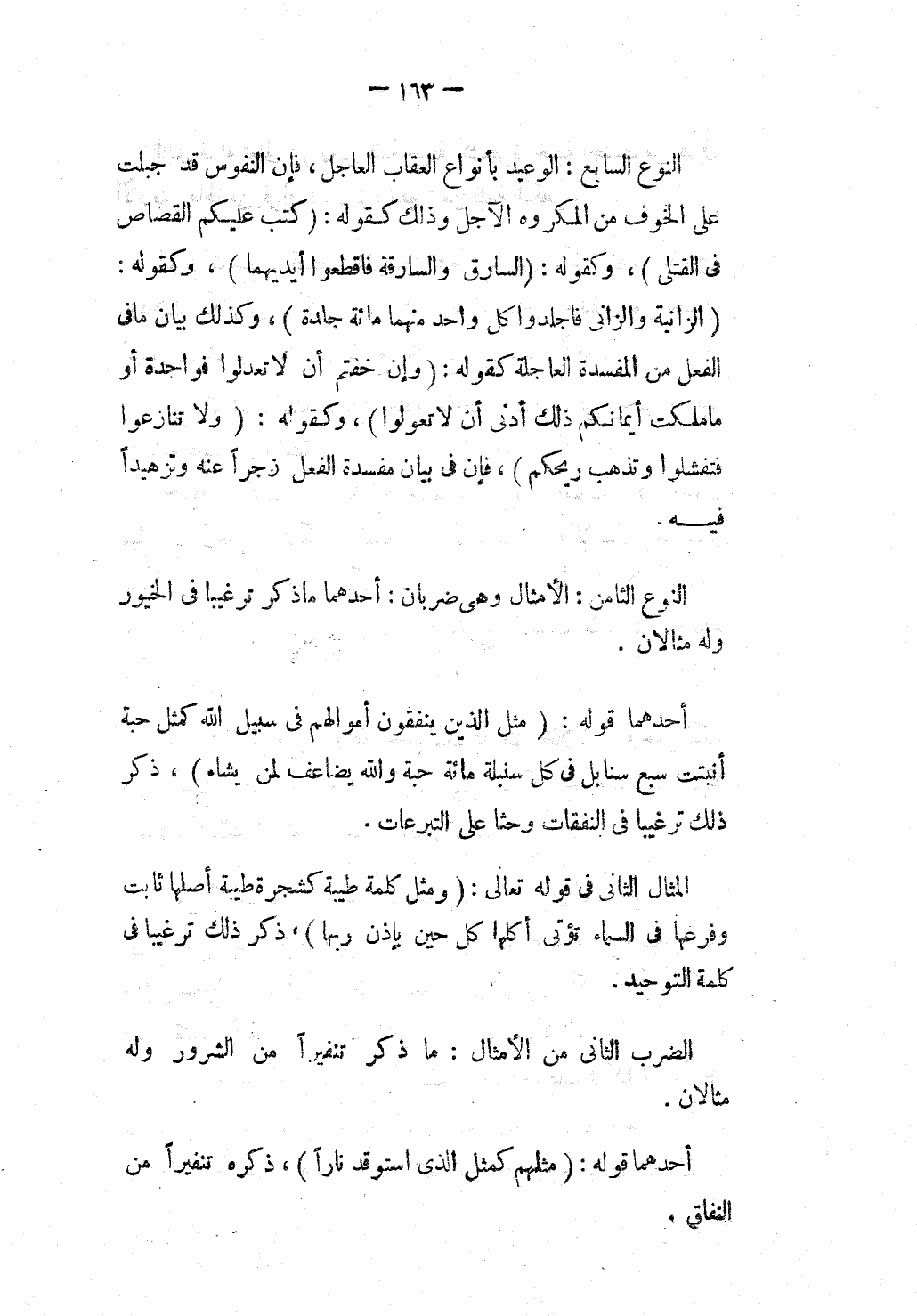 النَّوْعُ السَّابِعُ: الْوَعِيدُ بِأَنْوَاعِ الْعِقَابِ الْعَاجِلِ، فَإِنَّ النُّفُوسَ قَدْ جُبِلَتْ عَلَى الْخَوْفِ مِنْ الْمَكْرُوهِ الْآجِلِ وَذَلِكَ كَقَوْلِهِ: {كُتِبَ عَلَيْكُمُ الْقِصَاصُ فِي الْقَتْلَى} [البقرة: 178] ، وَكَقَوْلِهِ: {وَالسَّارِقُ وَالسَّارِقَةُ فَاقْطَعُوا أَيْدِيَهُمَا} [المائدة: 38] ، وَكَقَوْلِهِ: {الزَّانِيَةُ وَالزَّانِي فَاجْلِدُوا كُلَّ وَاحِدٍ مِنْهُمَا مِائَةَ جَلْدَةٍ} [النور: 2] .