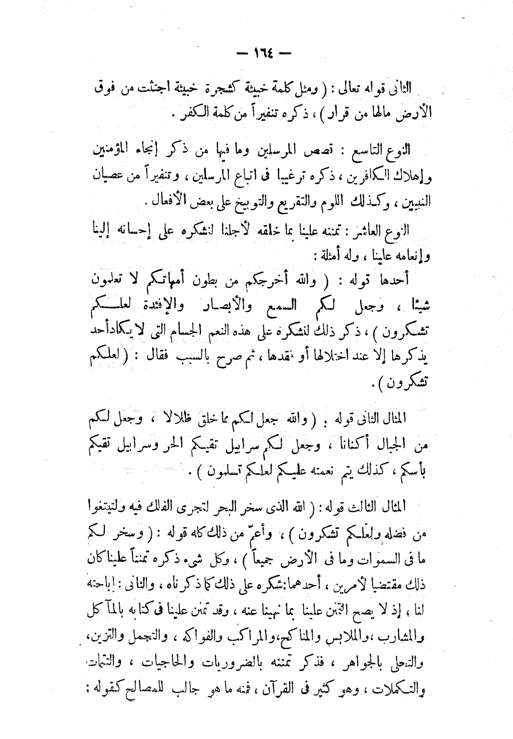 الْمِثَالُ الثَّالِثُ: قَوْلُهُ: {اللَّهُ الَّذِي سَخَّرَ لَكُمُ الْبَحْرَ لِتَجْرِيَ الْفُلْكُ فِيهِ بِأَمْرِهِ وَلِتَبْتَغُوا مِنْ فَضْلِهِ وَلَعَلَّكُمْ تَشْكُرُونَ} [الجاثية: 12] ، وَأَعَمُّ مِنْ ذَلِكَ كُلِّهِ قَوْلُهُ: {وَسَخَّرَ لَكُمْ مَا فِي السَّمَاوَاتِ وَمَا فِي الأَرْضِ جَمِيعًا} [الجاثية: 13] ، وَكُلُّ شَيْءٍ ذَكَرَهُ تُمَنِّنَا عَلَيْنَا كَانَ ذَلِكَ مُقْتَضِيًا لِأَمْرَيْنِ، أَحَدِهِمَا: شُكْرُهُ عَلَى ذَلِكَ كَمَا ذَكَرْنَاهُ.