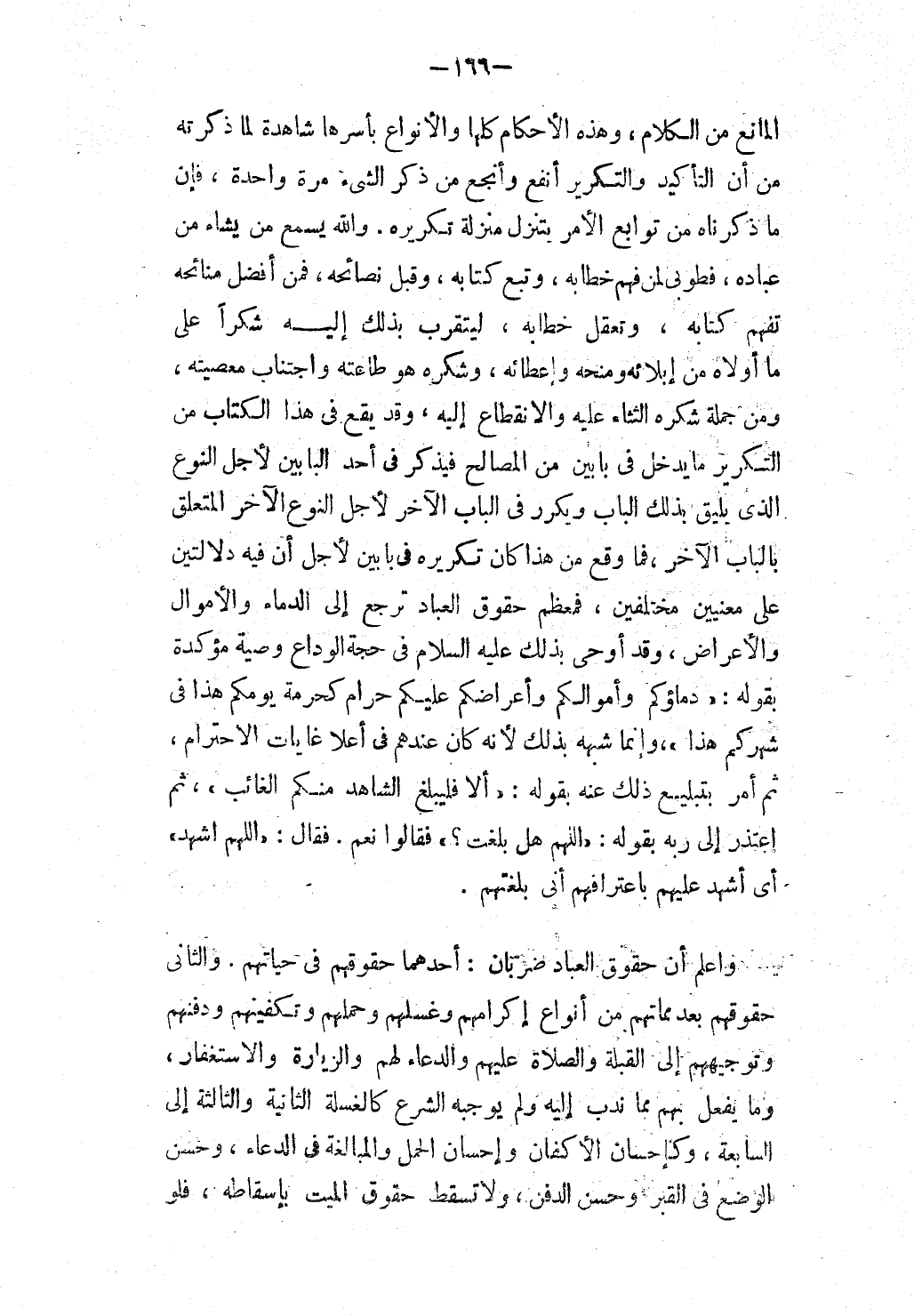 وَهَذِهِ الْأَحْكَامُ كُلُّهَا وَالْأَنْوَاعُ بِأَسْرِهَا شَاهِدَةٌ لِمَا ذَكَرْتُهُ مِنْ أَنَّ التَّأْكِيدَ وَالتَّكْرِيرَ أَنْفَعُ وَأَنْجَعُ مِنْ ذِكْرِ الشَّيْءِ مَرَّةً وَاحِدَةً، فَإِنَّ مَا ذَكَرْنَاهُ مِنْ تَوَابِعِ الْأَمْرِ يَتَنَزَّلُ مَنْزِلَةَ تَكْرِيرِهِ. وَاَللَّهُ يُسْمِعُ مَنْ يَشَاءُ مِنْ عِبَادِهِ، فَطُوبَى لِمَنْ فَهِمَ خِطَابَهُ، وَتَبِعَ كِتَابَهُ، وَقَبِلَ نَصَائِحَهُ، فَمِنْ أَفْضَلِ مَنَائِحِهِ تَفَهُّمُ كِتَابِهِ، وَتَعَقُّلُ خِطَابِهِ، لِيَتَقَرَّبَ بِذَلِكَ إلَيْهِ شُكْرًا عَلَى مَا أَوْلَاهُ مِنْ إبْلَائِهِ وَمَنْحِهِ وَإِعْطَائِهِ، وَشُكْرُهُ هُوَ طَاعَتُهُ وَاجْتِنَابُ مَعْصِيَتِهِ، وَمِنْ جُمْلَةِ شُكْرِهِ الثَّنَاءُ عَلَيْهِ وَالِانْقِطَاعُ إلَيْهِ، وَقَدْ يَقَعُ فِي هَذَا الْكِتَابِ مِنْ التَّكْرِيرِ مَا يَدْخُلُ فِي بَابَيْنِ مِنْ الْمَصَالِحِ فَيَذْكُرُ فِي أَحَدِ الْبَابَيْنِ لِأَجْلِ النَّوْعِ الَّذِي يَلِيقُ بِذَلِكَ الْبَابِ وَيُكَرِّرُ فِي الْبَابِ الْآخَرِ لِأَجْلِ النَّوْعِ الْآخَرِ الْمُتَعَلِّقِ بِالْبَابِ الْآخَرِ، فَمَا وَقَعَ مِنْ هَذَا كَانَ تَكْرِيرُهُ فِي بَابَيْنِ لِأَجْلِ أَنَّ فِيهِ دَلَالَتَيْنِ عَلَى مَعْنَيَيْنِ مُخْتَلِفَيْنِ، فَمُعْظَمُ حُقُوقِ الْعِبَادِ تَرْجِعُ إلَى الدِّمَاءِ وَالْأَمْوَالِ وَالْأَعْرَاضِ، وَقَدْ أَوْحَى بِذَلِكَ - عَلَيْهِ السَّلَامُ - فِي حَجَّةِ الْوَدَاعِ وَصِيَّةً مُؤَكَّدَةً بِقَوْلِهِ: «دِمَاؤُكُمْ وَأَمْوَالُكُمْ وَأَعْرَاضُكُمْ عَلَيْكُمْ حَرَامٌ كَحُرْمَةِ يَوْمِكُمْ هَذَا فِي شَهْرِكُمْ هَذَا» ، وَإِنَّمَا شَبَّهَهُ بِذَلِكَ لِأَنَّهُ كَانَ عِنْدَهُمْ فِي أَعْلَى غَايَاتِ الِاحْتِرَامِ، ثُمَّ أَمَرَ بِتَبْلِيغِ ذَلِكَ عَنْهُ بِقَوْلِهِ: «أَلَا فَلْيُبَلِّغْ الشَّاهِدُ مِنْكُمْ الْغَائِبَ» ، ثُمَّ اعْتَذَرَ إلَى رَبِّهِ بِقَوْلِهِ: «اللَّهُمَّ هَلْ بَلَّغْت؟ فَقَالُوا نَعَمْ. فَقَالَ: اللَّهُمَّ اشْهَدْ» أَيْ اشْهَدْ عَلَيْهِمْ بِاعْتِرَافِهِمْ أَنِّي بَلَّغْتهمْ.