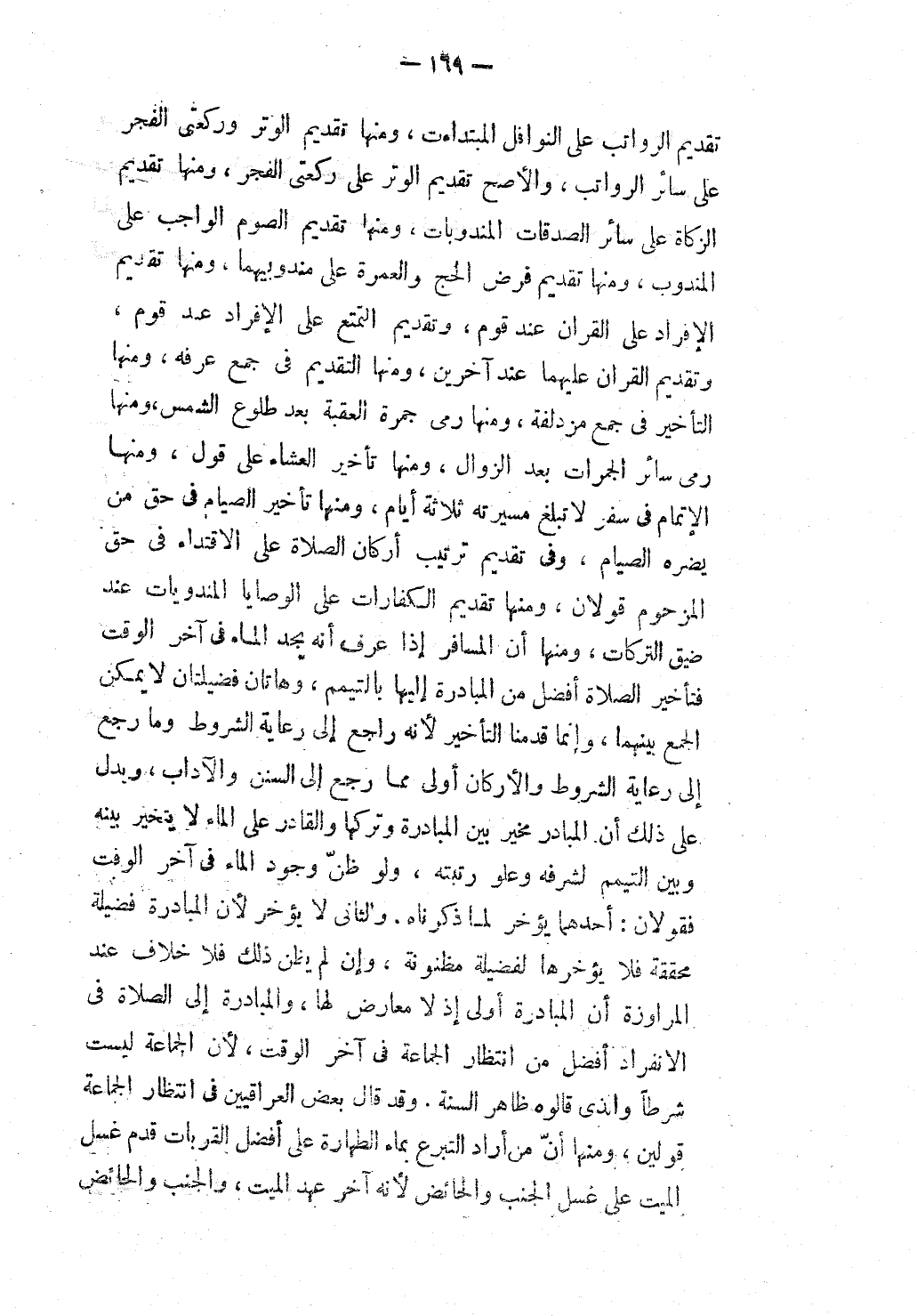 تَقْدِيمُ الرَّوَاتِبِ عَلَى النَّوَافِلِ الْمُبْتَدَآت، وَمِنْهَا تَقْدِيمُ الْوِتْرِ وَرَكْعَتَيْ الْفَجْرِ عَلَى سَائِرِ الرَّوَاتِبِ، وَالْأَصَحُّ تَقْدِيمُ الْوِتْرِ عَلَى رَكْعَتَيْ الْفَجْرِ، وَمِنْهَا تَقْدِيمُ الزَّكَاةِ عَلَى سَائِرِ الصَّدَقَاتِ الْمَنْدُوبَاتِ، وَمِنْهَا تَقْدِيمُ الصَّوْمِ الْوَاجِبِ عَلَى الْمَنْدُوبِ، وَمِنْهَا تَقْدِيمُ فَرْضِ الْحَجِّ وَالْعُمْرَةِ عَلَى مَنْدُوبَيْهِمَا، وَمِنْهَا تَقْدِيمُ الْإِفْرَادِ عَلَى الْقِرَانِ عِنْدَ قَوْمٍ، وَتَقْدِيمُ التَّمَتُّعِ عَلَى الْإِفْرَادِ عِنْدَ قَوْمٍ، وَتَقْدِيمُ الْقِرَانِ عَلَيْهِمَا عِنْدَ آخَرِينَ، وَمِنْهَا التَّقْدِيمُ فِي جَمْعِ عَرَفَةَ، وَمِنْهَا التَّأْخِيرُ فِي جَمْعِ مُزْدَلِفَةَ، وَمِنْهَا رَمْيُ جَمْرَةِ الْعَقَبَةِ بَعْدَ طُلُوعِ الشَّمْسِ، وَمِنْهَا رَمْيُ سَائِرِ الْجَمَرَاتِ بَعْدَ الزَّوَالِ.