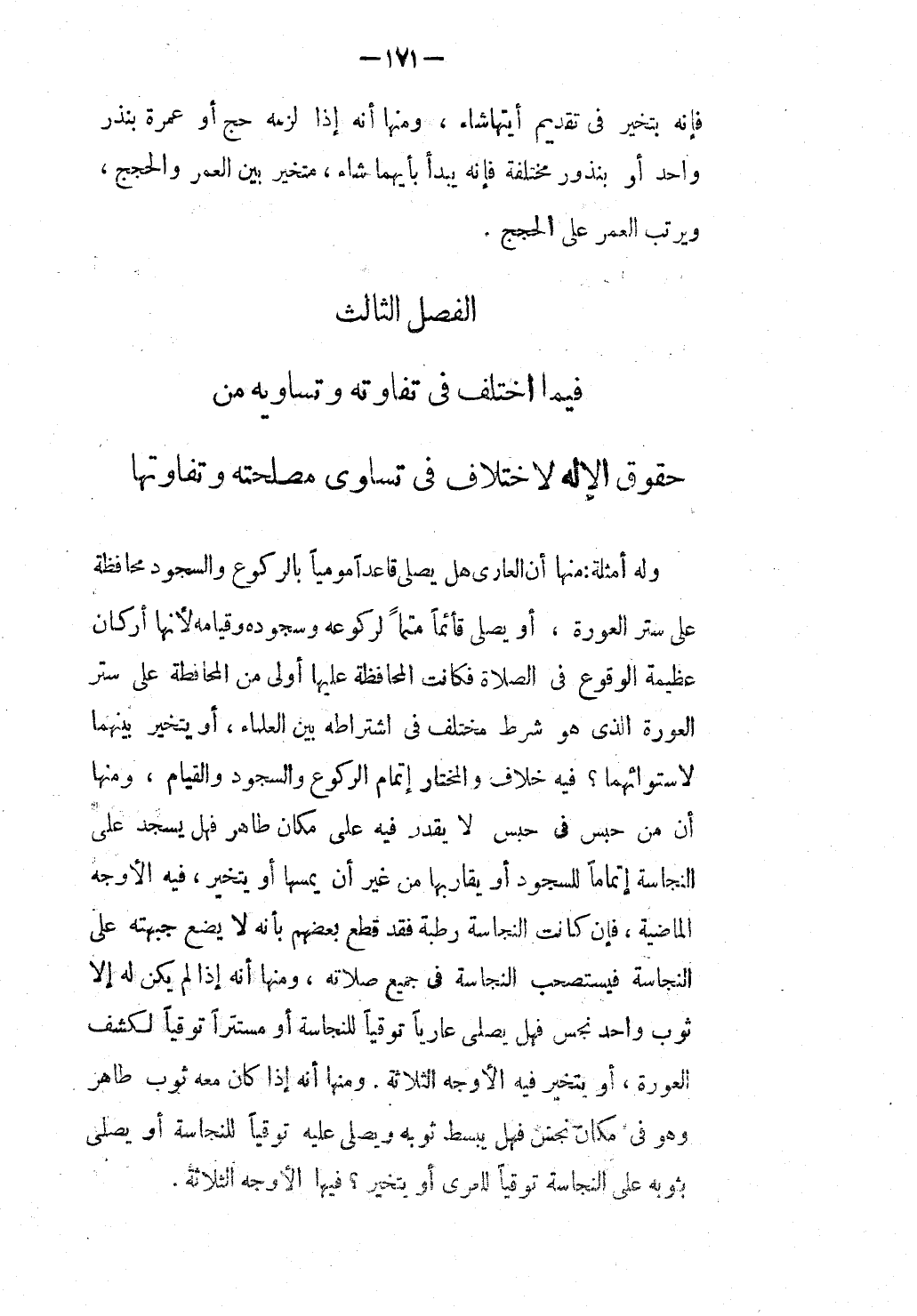 ِ لِاخْتِلَافٍ فِي تَسَاوِي مَصْلَحَتِهِ وَتَفَاوُتِهَا وَلَهُ أَمْثِلَةٌ: مِنْهَا أَنَّ الْعَارِيَ هَلْ يُصَلِّي قَاعِدًا مُومِيًا بِالرُّكُوعِ وَالسُّجُودِ مُحَافَظَةً عَلَى سَتْرِ الْعَوْرَةِ، أَوْ يُصَلِّي قَائِمًا مُتِمًّا لِرُكُوعِهِ وَسُجُودِهِ وَقِيَامِهِ لِأَنَّهَا أَرْكَانٌ عَظِيمَةُ الْوُقُوعِ فِي الصَّلَاةِ فَكَانَتْ الْمُحَافَظَةُ عَلَيْهَا أَوْلَى مِنْ الْمُحَافَظَةِ عَلَى سَتْرِ الْعَوْرَةِ الَّذِي هُوَ شَرْطٌ مُخْتَلَفٌ فِي اشْتِرَاطِهِ بَيْنَ الْعُلَمَاءِ، أَوْ يَتَخَيَّرُ بَيْنَهُمَا لِاسْتِوَائِهِمَا؟ فِيهِ خِلَافٌ وَالْمُخْتَارُ إتْمَامُ الرُّكُوعِ وَالسُّجُودِ وَالْقِيَامِ، وَمِنْهَا أَنَّ مَنْ حُبِسَ فِي حَبْسٍ لَا يَقْدِرُ فِيهِ عَلَى مَكَان طَاهِرٍ فَهَلْ يَسْجُدُ عَلَى النَّجَاسَةِ إتْمَامًا لِلسُّجُودِ أَوْ يُقَارِبُهَا مِنْ غَيْرِ أَنْ يَمَسَّهَا أَوْ يَتَخَيَّرُ، فِيهِ الْأَوْجُهُ الْمَاضِيَةُ، فَإِنْ كَانَتْ النَّجَاسَةُ رَطْبَةً فَقَدْ قَطَعَ بَعْضُهُمْ بِأَنَّهُ لَا يَضَعُ جَبْهَتَهُ عَلَى النَّجَاسَةِ فَيَسْتَصْحِبُ النَّجَاسَةَ فِي جَمِيعِ صَلَاتِهِ، وَمِنْهَا أَنَّهُ إذْ لَمْ يَكُنْ لَهُ إلَّا ثَوْبٌ وَاحِدٌ نَجِسٌ فَهَلْ يُصَلِّي عَارِيًّا تَوَقِّيًا لِلنَّجَاسَةِ أَوْ مُسْتَتِرًا تَوَقِّيًا لِكَشْفِ الْعَوْرَةِ، أَوْ يَتَخَيَّرُ؟ فِيهِ الْأَوْجُهُ الثَّلَاثَةُ. وَمِنْهَا أَنَّهُ إذَا كَانَ مَعَهُ ثَوْبٌ طَاهِرٌ وَهُوَ فِي مَكَان نَجِسٍ فَهَلْ يَبْسُطُ ثَوْبَهُ وَيُصَلِّي عَلَيْهِ تَوَقِّيًا لِلنَّجَاسَةِ أَوْ يُصَلِّي بِثَوْبِهِ عَلَى النَّجَاسَةِ تَوَقِّيًا لِلْعُرْيِ أَوْ يَتَخَيَّرُ؟ فِيهَا الْأَوْجُهُ الثَّلَاثَةُ.