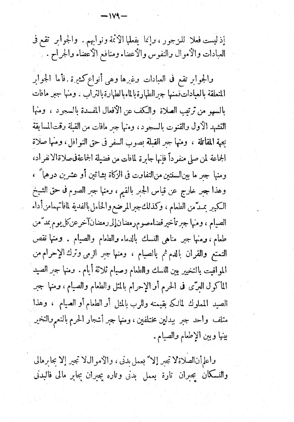وَالْجَوَابِرُ تَقَعُ فِي الْعِبَادَاتِ وَالْأَمْوَالِ وَالنُّفُوسِ وَالْأَعْضَاءِ وَمَنَافِعِ الْأَعْضَاءِ وَالْجِرَاحِ. وَالْجَوَابِرُ تَقَعُ فِي الْعِبَادَاتِ وَغَيْرِهَا وَهِيَ أَنْوَاعٌ كَثِيرَةٌ. فَأَمَّا الْجَوَابِرُ الْمُتَعَلِّقَةُ بِالْعِبَادَاتِ فَمِنْهَا جَبْرُ الطَّهَارَةِ بِالْمَاءِ بِالطَّهَارَةِ بِالتُّرَابِ، وَمِنْهَا جَبْرُ مَا فَاتَ بِالسَّهْوِ مِنْ تَرْتِيبِ الصَّلَاةِ وَالْكَفِّ عَنْ الْأَفْعَالِ الْمُفْسِدَةِ بِالسُّجُودِ، وَمِنْهَا التَّشَهُّدُ الْأَوَّلُ وَالْقُنُوتُ بِالسُّجُودِ، وَمِنْهَا جَبْرُ مَا فَاتَ مِنْ الْقِبْلَةِ وَقْتَ الْمُسَابَقَةِ بِجِهَةِ الْمُقَاتَلَةِ، وَمِنْهَا جَبْرُ الْقِبْلَةِ بِصَوْبِ السَّفَرِ فِي حَقِّ النَّوَافِلِ، وَمِنْهَا صَلَاةُ الْجَمَاعَةِ لِمَنْ صَلَّى مُنْفَرِدًا فَإِنَّهَا جَابِرَةٌ لِمَا فَاتَ مِنْ فَضِيلَةِ الْجَمَاعَةِ فِي صَلَاةِ الِانْفِرَادِ، وَمِنْهَا جَبْرُ مَا بَيْنَ السَّنَتَيْنِ مِنْ التَّفَاوُتِ فِي الزَّكَاةِ بِشَاتَيْنِ أَوْ عِشْرِينَ دِرْهَمًا، وَهَذَا جَبْرٌ خَارِجٌ عَنْ قِيَاسِ الْجَبْرِ بِالْقِيَمِ، وَمِنْهَا جَبْرُ الصَّوْمِ فِي حَقِّ الشَّيْخِ الْكَبِيرِ بِمُدٍّ مِنْ الطَّعَامِ، وَكَذَلِكَ جَبْرُ الْمُرْضِعِ وَالْحَامِلِ بِالْفِدْيَةِ لِمَا فَاتَهُمَا مِنْ أَدَاءِ الصِّيَامِ، وَمِنْهَا جَبْرُ تَأْخِيرِ قَضَاءِ صَوْمِ رَمَضَانَ إلَى رَمَضَانَ آخَرَ عَنْ كُلِّ يَوْمٍ بِمُدٍّ مِنْ طَعَامٍ، وَمِنْهَا جَبْرُ مَنَاهِي النُّسُكِ بِالدِّمَاءِ وَالطَّعَامِ وَالصِّيَامِ. وَمِنْهَا نَقْصُ التَّمَتُّعِ وَالْقِرَانِ بِالدَّمِ ثُمَّ بِالصِّيَامِ، وَمِنْهَا جَبْرُ الرَّمْيِ وَتَرْكِ الْإِحْرَامِ مِنْ الْمَوَاقِيتِ بِالتَّخْيِيرِ بَيْنَ النُّسُكِ وَالطَّعَامِ وَصِيَامِ ثَلَاثَةِ أَيَّامٍ. وَمِنْهَا جَبْرُ الصَّيْدِ الْمَأْكُولِ الْبَرِّيِّ فِي الْحَرَمِ أَوْ الْإِحْرَامِ بِالْمِثْلِ وَالطَّعَامِ وَالصِّيَامِ، وَمِنْهَا جَبْرُ الصَّيْدِ الْمَمْلُوكِ لِمَالِكِهِ بِقِيمَتِهِ وَلِلرَّبِّ بِالْمِثْلِ أَوْ الطَّعَامِ أَوْ الصِّيَامِ، وَهَذَا مُتْلِفٌ وَاحِدٌ جُبِرَ بِبَدَلَيْنِ مُخْتَلِفَيْنِ، وَمِنْهَا جَبْرُ أَشْجَارِ الْحَرَمِ بِالنَّعَمِ وَالتَّخَيُّرِ بَيْنَهَا وَبَيْنَ الْإِطْعَامِ وَالصِّيَامِ. وَاعْلَمْ أَنَّ الصَّلَاةَ لَا تُجْبَرُ إلَّا بِعَمَلٍ بَدَنِيٍّ، وَالْأَمْوَالَ لَا تُجْبَرُ إلَّا بِجَابِرٍ مَالِيٍّ وَالنُّسُكَانِ يُجْبَرَانِ تَارَةً بِعَمَلٍ بَدَنِيٍّ وَتَارَةً يُجْبَرَانِ بِجَابِرٍ مَالِيٍّ فَالْبَدَنِيُّ