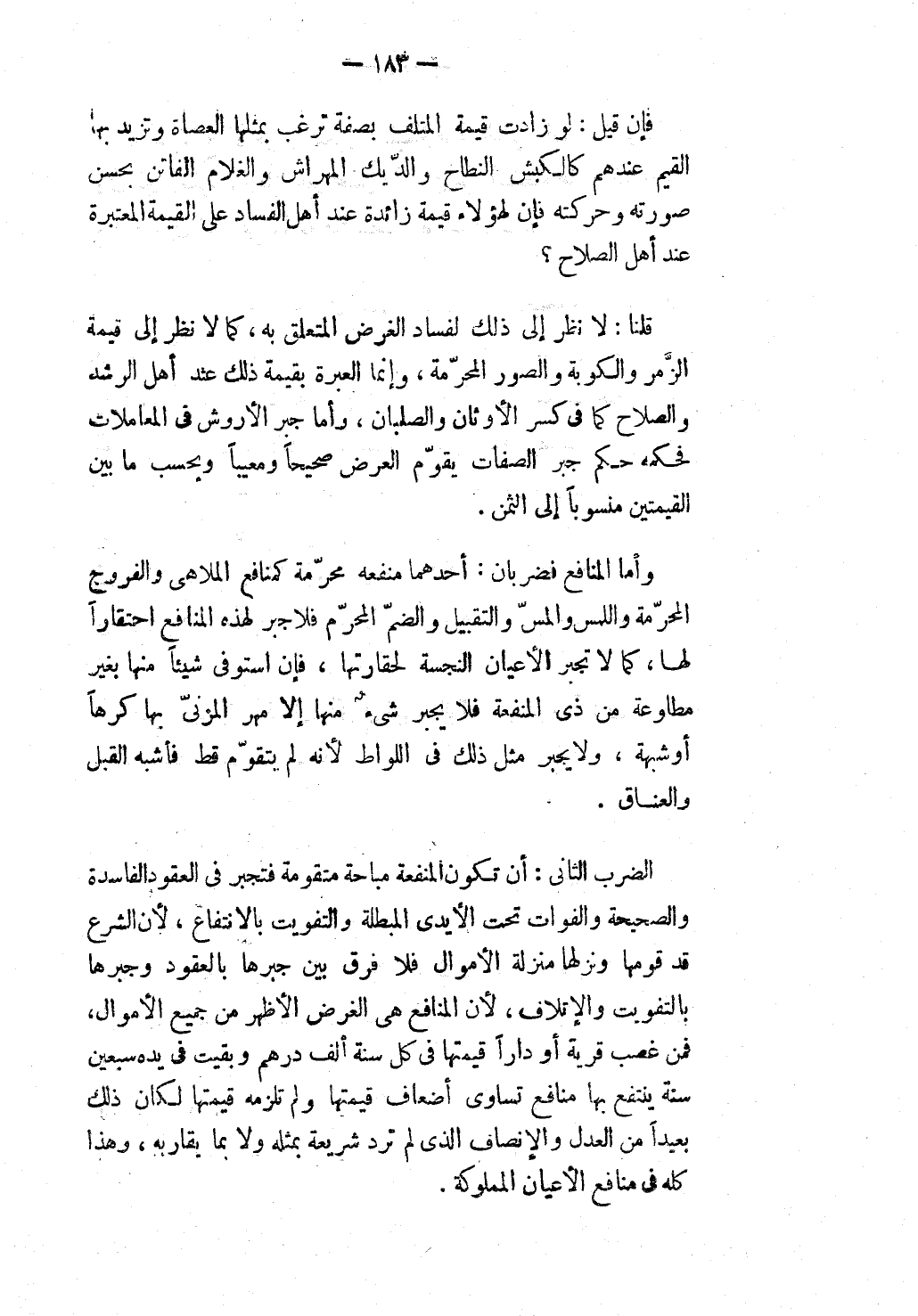 الضَّرْبُ الثَّانِي: أَنْ تَكُونَ الْمَنْفَعَةُ مُبَاحَةً مُتَقَوِّمَةً فَتُجْبَرُ فِي الْعُقُودِ الْفَاسِدَةِ وَالصَّحِيحَةِ وَالْفَوَاتُ تَحْتَ الْأَيْدِي الْمُبْطِلَةِ وَالتَّفْوِيتُ بِالِانْتِفَاعِ، لِأَنَّ الشَّرْعَ قَدْ قَوَّمَهَا وَنَزَّلَهَا مَنْزِلَةَ الْأَمْوَالِ فَلَا فَرْقَ بَيْنَ جَبْرِهَا بِالْعُقُودِ وَجَبْرِهَا بِالتَّفْوِيتِ وَالْإِتْلَافِ، لِأَنَّ الْمَنَافِعَ هِيَ الْغَرَضُ الْأَظْهَرُ مِنْ جَمِيعِ الْأَمْوَالِ، فَمَنْ غَصَبَ قَرْيَةً أَوْ دَارًا قِيمَتُهَا فِي كُلِّ سَنَةٍ أَلْفُ دِرْهَمٍ وَبَقِيَتْ فِي يَدِهِ سَبْعِينَ سَنَةً يَنْتَفِعُ بِهَا مَنَافِعَ تُسَاوِي أَضْعَافَ قِيمَتِهَا وَلَمْ تَلْزَمْهُ قِيمَتُهَا لَكَانَ ذَلِكَ بَعِيدًا مِنْ الْعَدْلِ وَالْإِنْصَافِ الَّذِي لَمْ تَرِدْ شَرِيعَةٌ بِمِثْلِهِ وَلَا بِمَا يُقَارِبُهُ، وَهَذَا كُلُّهُ فِي مَنَافِعِ الْأَعْيَانِ الْمَمْلُوكَةِ.
