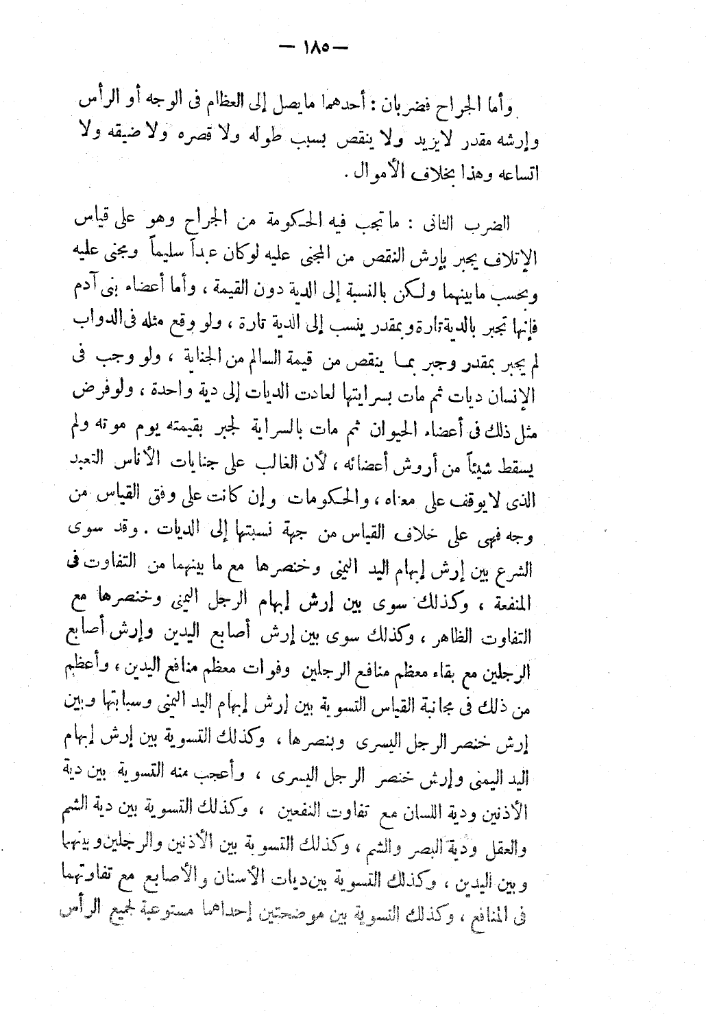 وَأَمَّا الْجِرَاحُ فَضَرْبَانِ: أَحَدُهُمَا مَا يَصِلُ إلَى الْعِظَامِ فِي الْوَجْهِ أَوْ الرَّأْسِ وَأَرْشُهُ مُقَدَّرٌ لَا يَزِيدُ وَلَا يَنْقُصُ بِسَبَبِ طُولِهِ وَلَا قِصَرِهِ وَلَا ضِيقِهِ وَلَا اتِّسَاعِهِ وَهَذَا بِخِلَافِ الْأَمْوَالِ.