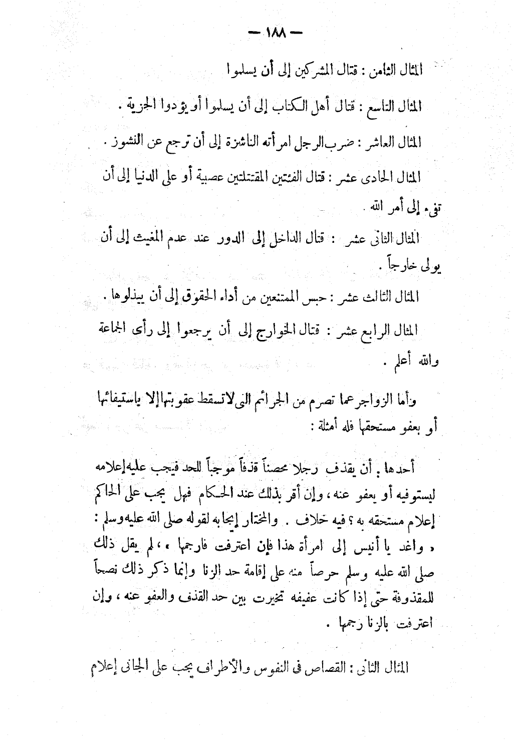 الْمِثَالُ الرَّابِعَ عَشَرَ: قِتَالُ الْخَوَارِجِ إلَى أَنْ يَرْجِعُوا إلَى رَأْيِ الْجَمَاعَةِ وَاَللَّهُ أَعْلَمُ.