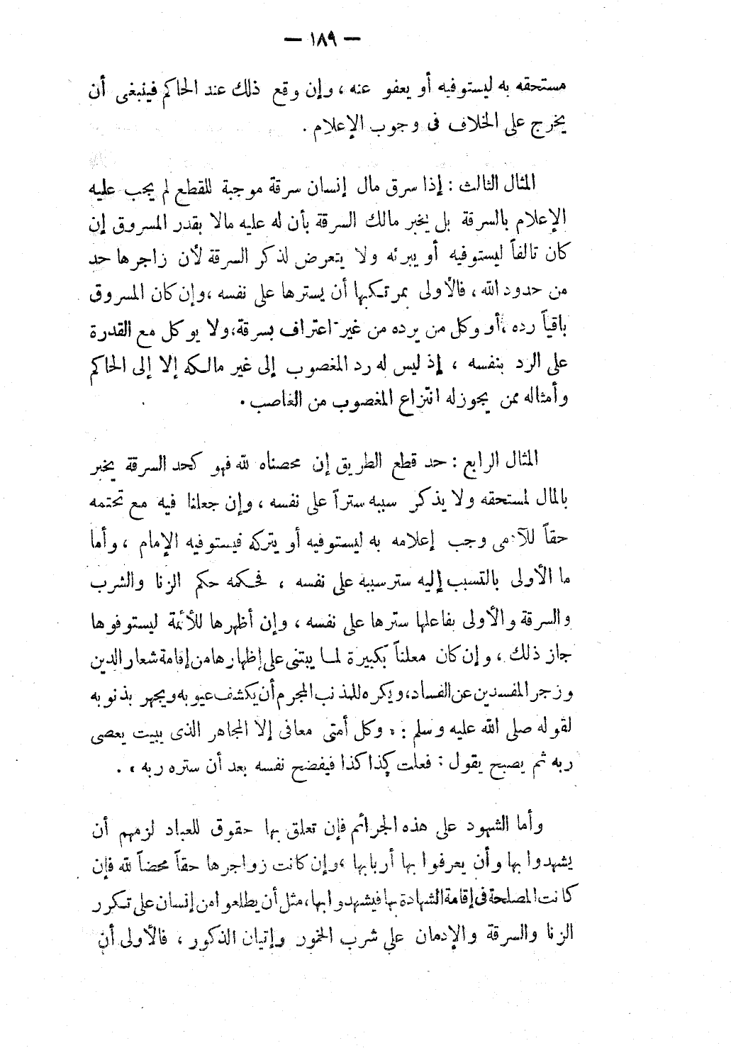 الْمِثَالُ الرَّابِعُ: حَدُّ قَطْعِ الطَّرِيقِ إنْ مَحَّصْنَاهُ لِلَّهِ فَهُوَ كَحَدِّ السَّرِقَةِ يُجْبَرُ بِالْمَالِ لِمُسْتَحِقِّهِ وَلَا يَذْكُرُ سَبَبَهُ سَتْرًا عَلَى نَفْسِهِ، وَإِنْ جَعَلْنَا فِيهِ مَعَ تَحَتُّمِهِ حَقًّا لِلْآدَمِيِّ وَجَبَ إعْلَامُهُ بِهِ لِيَسْتَوْفِيَهُ أَوْ يَتْرُكَهُ فَيَسْتَوْفِيَهُ الْإِمَامُ.