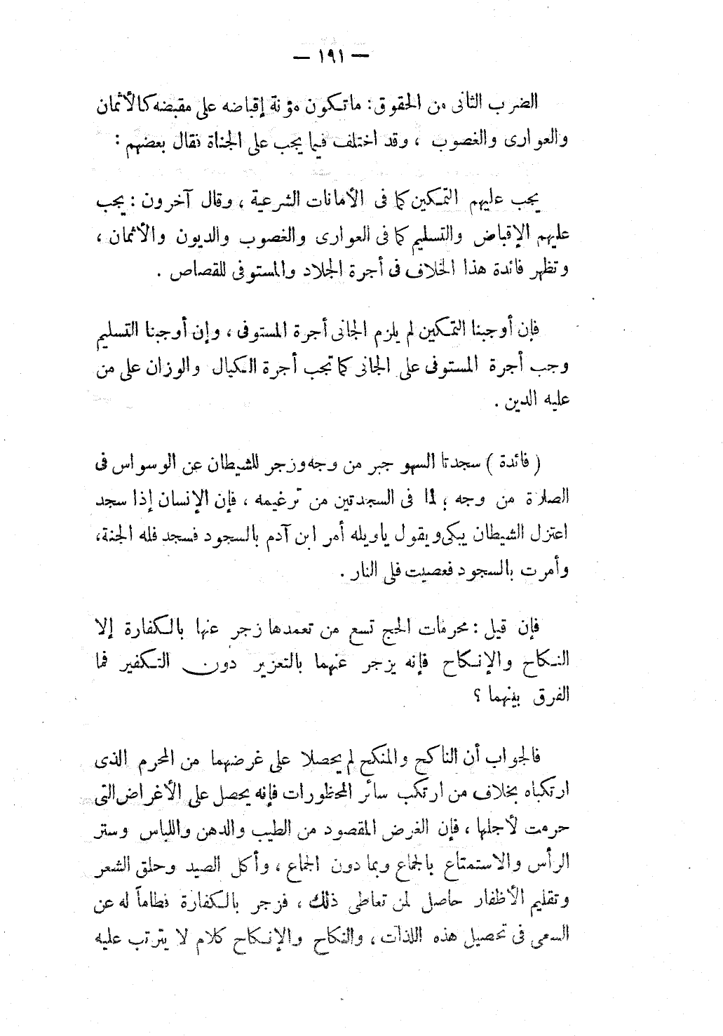 (فَائِدَةٌ) سَجْدَتَا السَّهْوِ جَبْرٌ مِنْ وَجْهٍ وَزَجْرٌ لِلشَّيْطَانٍ عَنْ الْوَسْوَاسِ فِي الصَّلَاةِ مِنْ وَجْهٍ؛ لِمَا فِي السَّجْدَتَيْنِ مِنْ تَرْغِيمِهِ، فَإِنَّ الْإِنْسَانَ إذَا سَجَدَ اعْتَزَلَ الشَّيْطَانُ يَبْكِي وَيَقُولُ يَا وَيْلَهُ أُمِرَ ابْنُ آدَمَ بِالسُّجُودِ فَسَجَدَ فَلَهُ الْجَنَّةُ، وَأُمِرْت بِالسُّجُودِ فَعَصَيْت فَلِي النَّارُ. فَإِنْ قِيلَ: مُحَرَّمَاتُ الْحَجِّ تِسْعٌ مَنْ تَعَمَّدَهَا زُجِرَ عَنْهَا بِالْكَفَّارَةِ إلَّا النِّكَاحُ وَالْإِنْكَاحُ فَإِنَّهُ يُزْجَرُ عَنْهُمَا بِالتَّعْزِيرِ دُونَ التَّكْفِيرِ فَمَا الْفَرْقُ بَيْنَهُمَا؟ فَالْجَوَابُ أَنَّ النَّاكِحَ وَالْمُنْكَحَ لَمْ يَحْصُلَا عَلَى غَرَضِهِمَا مِنْ الْمُحَرَّمِ الَّذِي ارْتَكَبَاهُ بِخِلَافِ مَنْ ارْتَكَبَ سَائِرَ الْمَحْظُورَاتِ فَإِنَّهُ يَحْصُلُ عَلَى الْأَغْرَاضِ الَّتِي حُرِّمَتْ لِأَجْلِهَا، فَإِنَّ الْغَرَضَ الْمَقْصُودَ مِنْ الطِّيبِ وَالدُّهْنِ وَاللِّبَاسِ وَسَتْرِ الرَّأْسِ وَالِاسْتِمْتَاعِ بِالْجِمَاعِ وَبِمَا دُونَ الْجِمَاعِ، وَأَكْلِ الصَّيْدِ وَحَلْقِ الشَّعْرِ وَتَقْلِيمِ الْأَظْفَارِ حَاصِلٌ لِمَنْ تَعَاطَى ذَلِكَ، فَزُجِرَ بِالْكَفَّارَةِ فِطَامًا لَهُ عَنْ السَّعْيِ فِي تَحْصِيلِ هَذِهِ اللَّذَّاتِ، وَالنِّكَاحُ وَالْإِنْكَاحُ كَلَامٌ لَا يَتَرَتَّبُ عَلَيْهِ