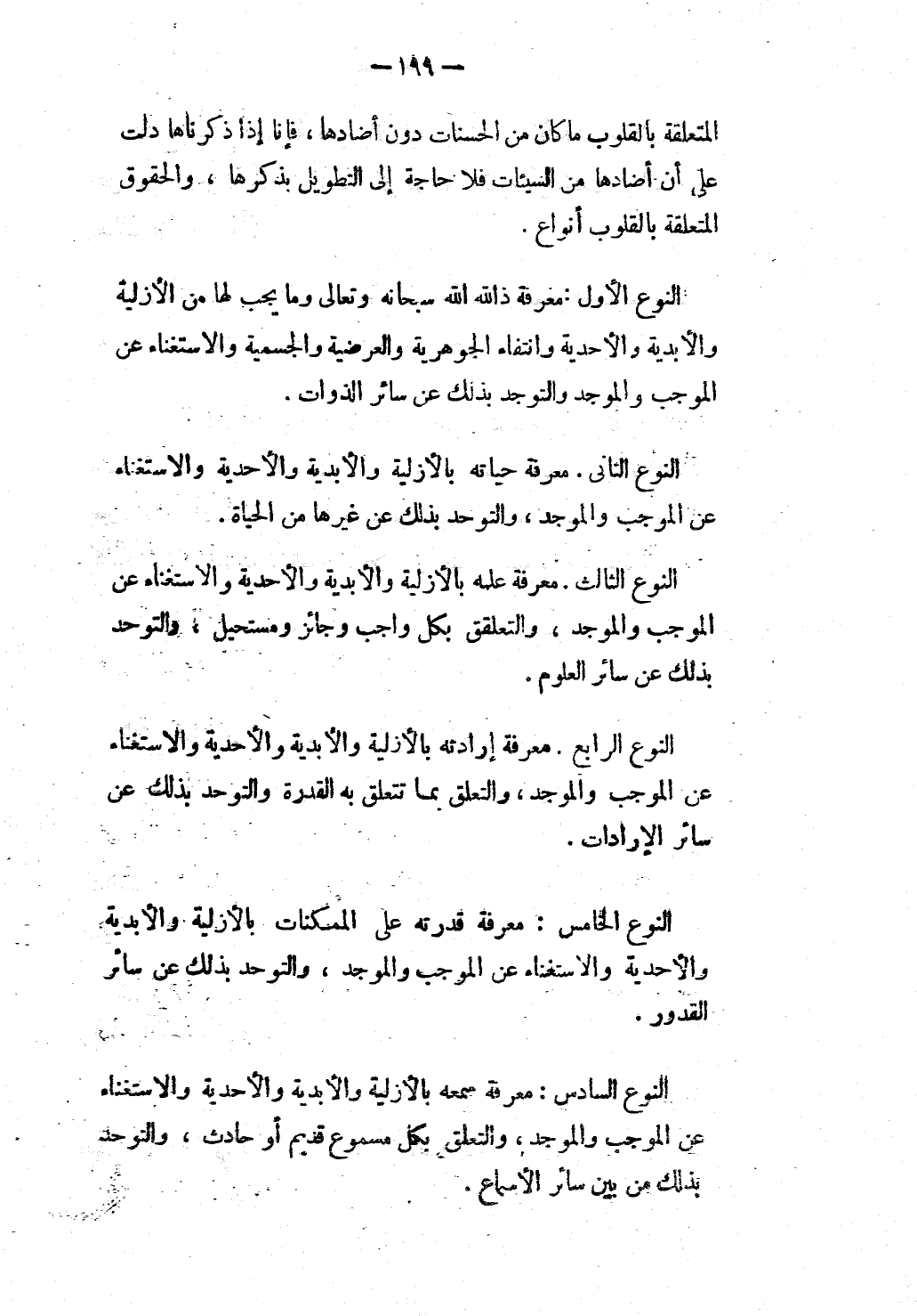 النَّوْعُ الْأَوَّلُ: مَعْرِفَةُ ذَاتِ اللَّهِ سُبْحَانَهُ وَتَعَالَى وَمَا يَجِبُ لَهَا مِنْ الْأَزَلِيَّةِ وَالْأَبَدِيَّةِ وَالْأَحْدِيَةِ وَانْتِفَاءِ الْجَوْهَرِيَّةِ وَالْعَرَضِيَّةِ وَالْجِسْمِيَّةِ وَالِاسْتِغْنَاءِ عَنْ الْمُوجِبِ وَالْمُوجِدِ وَالتَّوَجُّدِ بِذَلِكَ عَنْ سَائِرِ الذَّوَاتِ.