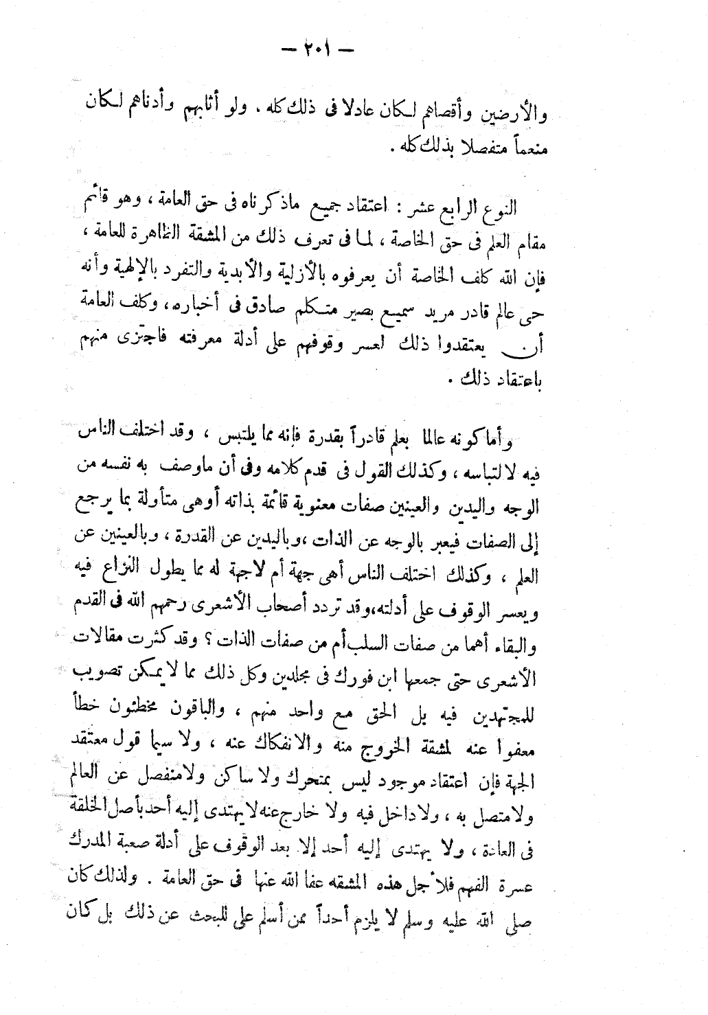 النَّوْعُ الرَّابِعَ عَشَرَ: اعْتِقَادُ جَمِيعِ مَا ذَكَرْنَاهُ فِي حَقِّ الْعَامَّةِ، وَهُوَ قَائِمٌ مَقَامَ الْعِلْمِ فِي حَقِّ الْخَاصَّةِ، لِمَا فِي تَعَرُّفِ ذَلِكَ مِنْ الْمَشَقَّةِ الظَّاهِرَةِ لِلْعَامَّةِ، فَإِنَّ اللَّهَ كَلَّفَ الْخَاصَّةَ أَنْ يَعْرِفُوهُ بِالْأَزَلِيَّةِ وَالْأَبَدِيَّةِ وَالتَّفَرُّدِ بِالْإِلَهِيَّةِ وَأَنَّهُ حَيٌّ عَالِمٌ قَادِرٌ مُرِيدٌ سَمِيعٌ بَصِيرٌ مُتَكَلِّمٌ صَادِقٌ فِي أَخْبَارِهِ، وَكَلَّفَ الْعَامَّةَ أَنْ يَعْتَقِدُوا ذَلِكَ لِعُسْرِ وُقُوفِهِمْ عَلَى أَدِلَّةِ مَعْرِفَتِهِ فَاجْتَزَى مِنْهُمْ بِاعْتِقَادِ ذَلِكَ.