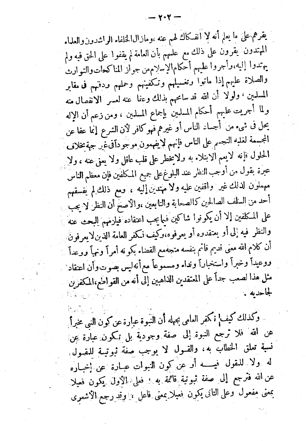 يُقِرُّهُمْ عَلَى مَا يَعْلَمُ أَنَّهُ لَا انْفِكَاكَ لَهُمْ عَنْهُ، وَمَا زَالَ الْخُلَفَاءُ الرَّاشِدُونَ وَالْعُلَمَاءُ الْمُهْتَدُونَ يُقِرُّونَ عَلَى ذَلِكَ مَعَ عِلْمِهِمْ بِأَنَّ الْعَامَّةَ لَمْ يَقِفُوا عَلَى الْحَقِّ فِيهِ وَلَمْ يَهْتَدُوا إلَيْهِ، وَأَجْرُوا عَلَيْهِمْ أَحْكَامَ الْإِسْلَامِ مِنْ جَوَازِ الْمُنَاكَحَاتِ وَالتَّوَارُثِ وَالصَّلَاةِ عَلَيْهِمْ إذَا مَاتُوا وَتَغْسِيلِهِمْ وَتَكْفِينِهِمْ وَحَمْلِهِمْ وَدَفْنِهِمْ فِي مَقَابِرِ الْمُسْلِمِينَ، وَلَوْلَا أَنَّ اللَّهَ قَدْ سَامَحَهُمْ بِذَلِكَ وَعَفَا عَنْهُ لِعُسْرِ الِانْفِصَالِ مِنْهُ وَلَمَا أُجْرِيَتْ عَلَيْهِمْ أَحْكَامُ الْمُسْلِمِينَ بِإِجْمَاعِ الْمُسْلِمِينَ، وَمَنْ زَعَمَ أَنَّ الْإِلَهَ يَحِلُّ فِي شَيْءٍ مِنْ أَجْسَادِ النَّاسِ أَوْ غَيْرِهِمْ فَهُوَ كَافِرٌ لِأَنَّ الشَّرْعَ إنَّمَا عَفَا عَنْ الْمُجَسَّمَةِ لِغَلَبَةِ التَّجَسُّمِ عَلَى النَّاسِ فَإِنَّهُمْ لَا يَفْهَمُونَ مَوْجُودًا فِي غَيْرِ جِهَةٍ بِخِلَافِ الْحُلُولِ فَإِنَّهُ لَا يَعُمُّ الِابْتِلَاءُ بِهِ وَلَا يَخْطِرُ عَلَى قَلْبِ عَاقِلٍ وَلَا يُعْفَى عَنْهُ، وَلَا عِبْرَةَ بِقَوْلِ مَنْ أَوْجَبَ النَّظَرَ عِنْدَ الْبُلُوغِ عَلَى جَمِيعِ الْمُكَلَّفِينَ فَإِنَّ مُعْظَمَ النَّاسِ مُهْمِلُونَ لِذَلِكَ غَيْرُ وَاقِفِينَ عَلَيْهِ وَلَا مُهْتَدِينَ إلَيْهِ، وَمَعَ ذَلِكَ لَمْ يُفَسِّقْهُمْ أَحَدٌ مِنْ السَّلَفِ الصَّالِحِينَ كَالصَّحَابَةِ وَالتَّابِعِينَ، وَالْأَصَحُّ أَنَّ النَّظَرَ لَا يَجِبُ عَلَى الْمُكَلَّفِينَ إلَّا أَنْ يَكُونُوا شَاكِّينَ فِيمَا يَجِبُ اعْتِقَادُهُ فَيَلْزَمُهُمْ الْبَحْثُ عَنْهُ وَالنَّظَرُ فِيهِ إلَى أَنْ يَعْتَقِدُوهُ أَوْ يَعْرِفُوهُ، وَكَيْفَ نُكَفِّرُ الْعَامَّةَ الَّذِينَ لَا يَعْرِفُونَ أَنَّ كَلَامَ اللَّهِ مَعْنًى قَدِيمٌ قَائِمٌ بِنَفْسِهِ مُتَّجَهٌ مَعَ الْقَضَاءِ بِكَوْنِهِ أَمْرًا وَنَهْيًا وَوَعْدًا وَوَعِيدًا وَخَبَرًا وَاسْتِخْبَارًا وَنِدَاءً وَمَسْمُوعًا مَعَ أَنَّهُ لَيْسَ بِصَوْتٍ وَأَنَّ اعْتِقَادَ مِثْلِ هَذَا لَصَعْبٌ جِدًّا عَلَى الْمُعْتَقِدِينَ الذَّاهِبِينَ إلَى أَنَّهُ مِنْ الْقَوَاطِعِ، الْمُكَفِّرِينَ لِجَاحِدِيهِ.