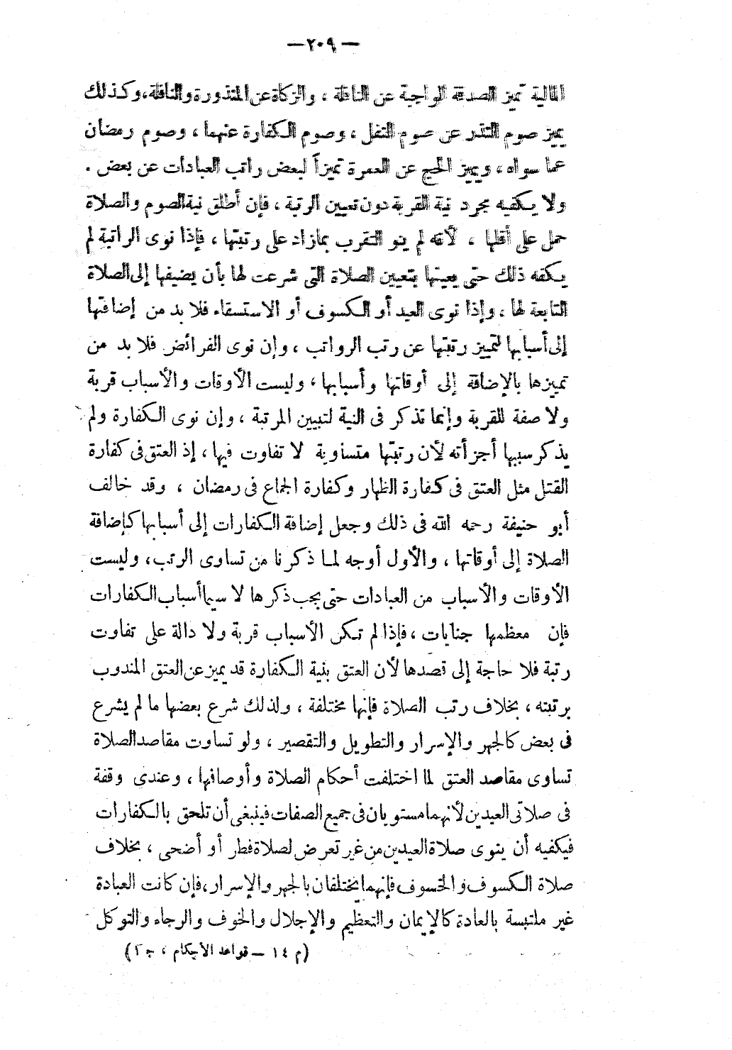 وَقَدْ خَالَفَ أَبُو حَنِيفَةَ - رَحِمَهُ اللَّهُ - فِي ذَلِكَ وَجَعَلَ إضَافَةَ الْكَفَّارَاتِ إلَى أَسْبَابِهَا كَإِضَافَةِ الصَّلَاةِ إلَى أَوْقَاتِهَا، وَالْأَوَّلُ أَوْجَهُ لِمَا ذَكَرْنَا مِنْ تَسَاوِي الرُّتَبِ، وَلَيْسَتْ الْأَوْقَاتُ وَالْأَسْبَابُ مِنْ الْعِبَادَاتِ حَتَّى يَجِبَ ذِكْرُهَا لَا سِيَّمَا أَسْبَابَ الْكَفَّارَاتِ فَإِنَّ مُعْظَمَهَا جِنَايَاتٌ، فَإِذَا لَمْ تَكُنْ الْأَسْبَابُ قُرْبَةً وَلَا دَالَّةً عَلَى تَفَاوُتِ رُتْبَةٍ فَلَا حَاجَةَ إلَى قَصْدِهَا لِأَنَّ الْعِتْقَ بِنِيَّةِ الْكَفَّارَةِ قَدْ يُمَيَّزُ عَنْ الْعِتْقِ الْمَنْدُوبِ بِرُتْبَتِهِ، بِخِلَافِ رُتَبِ الصَّلَاةِ فَإِنَّهَا مُخْتَلِفَةٌ، وَلِذَلِكَ شَرَعَ بَعْضَهَا مَا لَمْ يَشْرَعْ فِي بَعْضٍ كَالْجَهْرِ وَالْإِسْرَارِ وَالتَّطْوِيلِ وَالتَّقْصِيرِ، وَلَوْ تَسَاوَتْ مَقَاصِدُ الصَّلَاةِ تَسَاوَتْ مَقَاصِدُ الْعِتْقِ لِمَا اخْتَلَفَتْ أَحْكَامُ الصَّلَاةِ وَأَوْصَافُهَا، وَعِنْدِي وَقْفَةٌ فِي صَلَاتَيْ الْعِيدَيْنِ لِأَنَّهُمَا مُسْتَوِيَانِ فِي جَمِيعِ الصِّفَاتِ فَيَنْبَغِي أَنْ تُلْحَقَ بِالْكَفَّارَاتِ فَيَكْفِيهِ أَنْ يَنْوِيَ صَلَاةَ الْعِيدَيْنِ مِنْ غَيْرِ تَعَرُّضٍ لِصَلَاةِ فِطْرٍ أَوْ أَضْحَى، بِخِلَافِ صَلَاةِ الْكُسُوفِ وَالْخُسُوفِ فَإِنَّهُمَا يَخْتَلِفَانِ بِالْجَهْرِ وَالْإِسْرَارِ، فَإِنْ كَانَتْ الْعِبَادَةُ غَيْرَ مُلْتَبِسَةٍ بِالْعَادَةِ كَالْإِيمَانِ وَالتَّعْظِيمِ وَالْإِجْلَالِ وَالْخَوْفِ وَالرَّجَاءِ وَالتَّوَكُّلِ