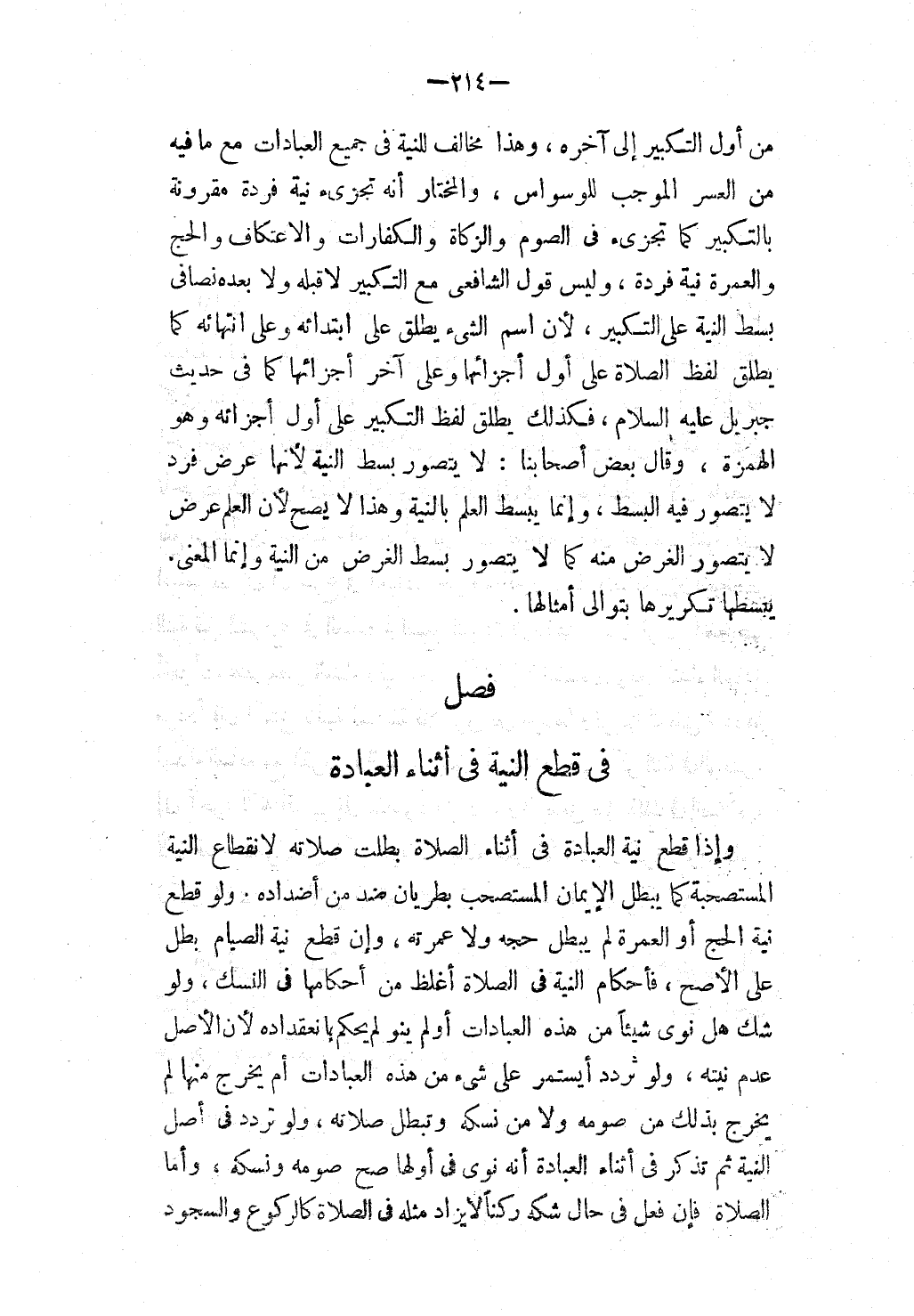 فَصْلٌ فِي قَطْعِ النِّيَّةِ فِي أَثْنَاءِ الْعِبَادَةِ وَإِذَا قَطَعَ نِيَّةَ الْعِبَادَةِ فِي أَثْنَاءِ الصَّلَاةِ بَطَلَتْ صَلَاتُهُ لِانْقِطَاعِ النِّيَّةِ الْمُسْتَصْحِبَةِ كَمَا يَبْطُلُ الْإِيمَانُ الْمُسْتَصْحِبُ بِطَرَيَانِ ضِدٍّ مِنْ أَضْدَادِهِ.