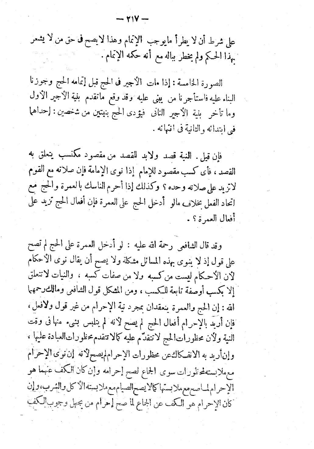 وَقَدْ قَالَ الشَّافِعِيُّ رَحْمَةُ اللَّهِ عَلَيْهِ: لَوْ أَدْخَلَ الْعُمْرَةَ عَلَى الْحَجِّ لَمْ تَصِحَّ عَلَى قَوْلٍ إذْ لَا يَنْوِي بِهَذِهِ الْمَسَائِلَ مُشْكِلَةً وَلَا يَصِحَّ أَنْ يُقَالَ نَوَى الْأَحْكَامَ لِأَنَّ الْأَحْكَامَ لَيْسَتْ مِنْ كَسْبِهِ وَلَا مِنْ صِفَاتِ كَسْبِهِ، وَالنِّيَّاتُ لَا تَتَعَلَّقُ إلَّا بِكَسْبٍ أَوْ صِفَةٍ تَابِعَةٍ لِلْكَسْبِ، وَمِنْ الْمُشْكِلِ قَوْلُ الشَّافِعِيِّ وَمَالِكٍ رَحِمَهُمَا اللَّهُ: إنَّ الْحَجَّ وَالْعُمْرَةَ يَنْعَقِدَانِ بِمُجَرَّدِ نِيَّةِ الْإِحْرَامِ مِنْ غَيْرِ قَوْلٍ وَلَا فِعْلٍ، فَإِنْ أُرِيدَ بِالْإِحْرَامِ أَفْعَالُ الْحَجِّ لَمْ يَصِحَّ لِأَنَّهُ لَمْ يَتَلَبَّسْ بِشَيْءٍ مِنْهَا فِي وَقْتِ النِّيَّةِ وَلِأَنَّ مَحْظُورَاتِ الْحَجِّ لَا تَتَقَدَّمُ عَلَيْهِ كَمَا لَا تَتَقَدَّمُ مَحْظُورَاتُ الْعِبَادَةِ عَلَيْهَا، وَإِنْ أُرِيدَ بِهِ الِانْفِكَاكُ عَنْ مَحْظُورَاتِ الْإِحْرَامِ لَمْ يَصِحَّ لِأَنَّهُ إنْ نَوَى الْإِحْرَامَ مَعَ مُلَابَسَتِهِ لِمَحْظُورَاتٍ سِوَى الْجِمَاعِ لَصَحَّ إحْرَامُهُ وَإِنْ كَانَ الْكَفُّ عَنْهُمَا هُوَ الْإِحْرَامُ لَمَا صَحَّ مَعَ مُلَابَسَتِهَا كَمَا لَا يَصِحُّ الصِّيَامُ مَعَ مُلَابَسَتِهِ الْأَكْلَ وَالشُّرْبَ، وَإِنْ كَانَ الْإِحْرَامُ هُوَ الْكَفُّ عَنْ الْجِمَاعِ لَمَا صَحَّ إحْرَامُ مَنْ يَجْهَلُ وُجُوبَ الْكَفِّ