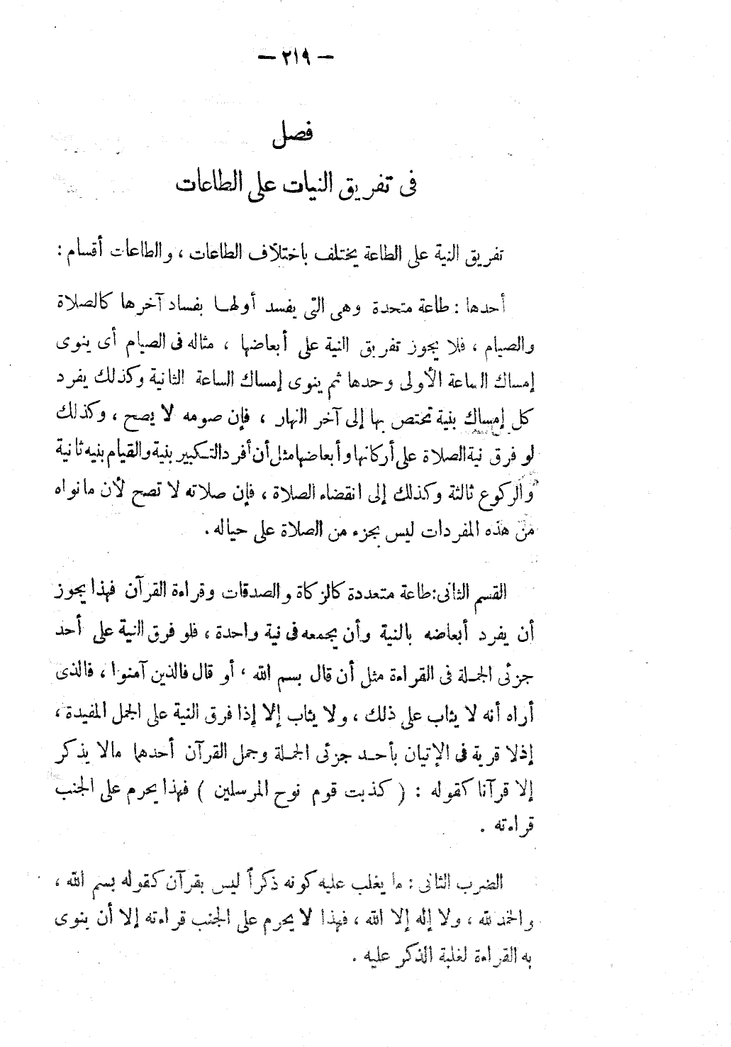 الْقِسْمُ الثَّانِي: طَاعَةٌ مُتَعَدِّدَةٌ كَالزَّكَاةِ وَالصَّدَقَاتِ وَقِرَاءَةِ الْقُرْآنِ فَهَذَا يَجُوزُ أَنْ يُفْرِدَ أَبْعَاضَهُ بِالنِّيَّةِ وَأَنْ يَجْمَعَهُ فِي نِيَّةٍ وَاحِدَةٍ، فَلَوْ فَرَّقَ النِّيَّةَ عَلَى أَحَدِ جُزْئَيْ الْجُمْلَةِ فِي الْقِرَاءَةِ مِثْلُ أَنْ قَالَ بِسْمِ اللَّهِ، أَوْ قَالَ فَاَلَّذِينَ آمَنُوا، فَاَلَّذِي أَرَاهُ أَنَّهُ لَا يُثَابُ عَلَى ذَلِكَ، وَلَا يُثَابُ إلَّا إذَا فَرَّقَ النِّيَّةَ عَلَى الْجُمَلِ الْمُفِيدَةِ، إذْ لَا قِيمَةَ فِي الْإِتْيَانِ بِأَحَدِ جُزْئَيْ الْجُمْلَةِ وَجُمَلُ الْقُرْآنِ أَحَدُهَا مَا لَا يُذْكَرُ إلَّا قُرْآنًا كَقَوْلِهِ: {كَذَّبَتْ قَوْمُ نُوحٍ الْمُرْسَلِينَ} [الشعراء: 105] فَهَذَا يَحْرُمُ عَلَى الْجُنُبِ قِرَاءَتُهُ.