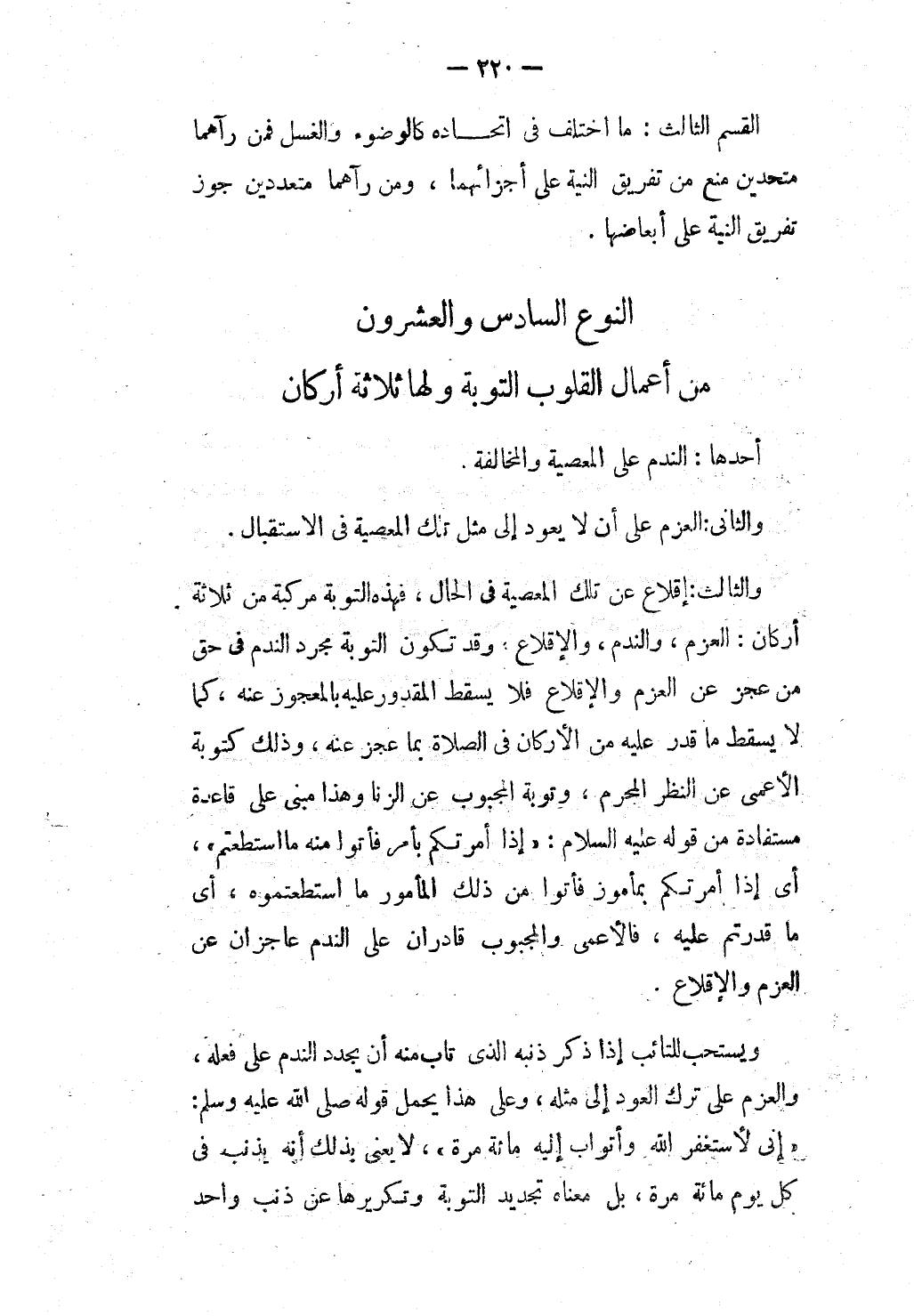 النَّوْعُ السَّادِسُ وَالْعِشْرِينَ مِنْ أَعْمَالِ الْقُلُوبِ التَّوْبَةُ وَلَهَا ثَلَاثَةُ أَرْكَانٍ أَحَدُهُمَا: النَّدَمُ عَلَى الْمَعْصِيَةِ وَالْمُخَالَفَةِ.