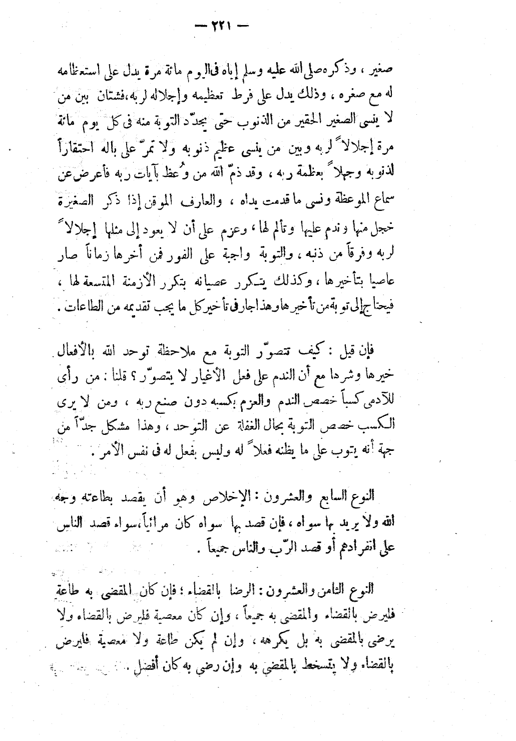 النَّوْعُ الثَّامِنُ وَالْعِشْرُونَ الرِّضَا بِالْقَضَاءِ: فَإِنْ كَانَ الْمَقْضِيُّ بِهِ طَاعَةً فَلْيَرْضَ بِالْقَضَاءِ وَالْمَقْضِيِّ بِهِ جَمِيعًا، وَإِنْ كَانَ مَعْصِيَةً فَلْيَرْضَ بِالْقَضَاءِ وَلَا يَرْضَى بِالْمَقْضِيِّ بِهِ بَلْ يَكْرَهُهُ، وَإِنْ لَمْ يَكُنْ طَاعَةً وَلَا مَعْصِيَةً فَلْيَرْضَ بِالْقَضَاءِ وَلَا يَتَسَخَّطُ بِالْمَقْضِيِّ بِهِ وَإِنْ رَضِيَ بِهِ كَانَ أَفْضَلَ.
