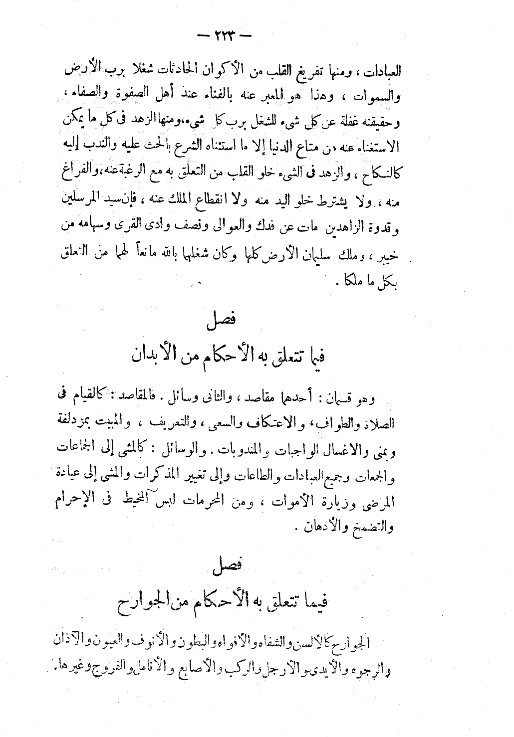 الْعِبَادَاتِ، وَمِنْهَا تَفْرِيغُ الْقَلْبِ مِنْ الْأَكْوَانِ الْحَادِثَاتِ شُغْلًا بِرَبِّ الْأَرْضِ وَالسَّمَوَاتِ، وَهَذَا هُوَ الْمُعَبَّرُ عَنْهُ بِالْفَنَاءِ عِنْدَ أَهْلِ الصَّفْوَةِ وَالصَّفَاءِ، وَحَقِيقَتُهُ غَفْلَةٌ عَنْ كُلِّ شَيْءٍ لِلشَّغْلِ بِرَبِّ كُلِّ شَيْءٍ، وَمِنْهَا الزُّهْدُ فِي كُلِّ مَا يُمْكِنُ الِاسْتِغْنَاءُ عَنْهُ مِنْ مَتَاعِ الدُّنْيَا إلَّا مَا اسْتَثْنَاهُ الشَّرْعُ بِالْحَثِّ عَلَيْهِ وَالنَّدْبِ إلَيْهِ كَالنِّكَاحِ، وَالزُّهْدُ فِي الشَّيْءِ خُلُوُّ الْقَلْبِ مِنْ التَّعَلُّقِ بِهِ مَعَ الرَّغْبَةِ عَنْهُ، وَالْفَرَاغِ مِنْهُ، وَلَا يُشْتَرَطُ خُلُوُّ الْيَدِ مِنْهُ وَلَا انْقِطَاعُ الْمِلْكِ عَنْهُ، فَإِنَّ سَيِّدَ الْمُرْسَلِينَ وَقُدْوَةَ الزَّاهِدِينَ مَاتَ عَنْ فَدَكَ وَالْعَوَالِي وَنِصْفِ وَادِي الْقُرَى وَسِهَامِهِ مِنْ خَيْبَرَ، وَمَلَكَ سُلَيْمَانُ الْأَرْضَ كُلَّهَا وَكَانَ شُغْلُهُمَا بِاَللَّهِ مَانِعًا لَهُمَا مِنْ التَّعَلُّقِ بِكُلِّ مَا مَلَكَا.