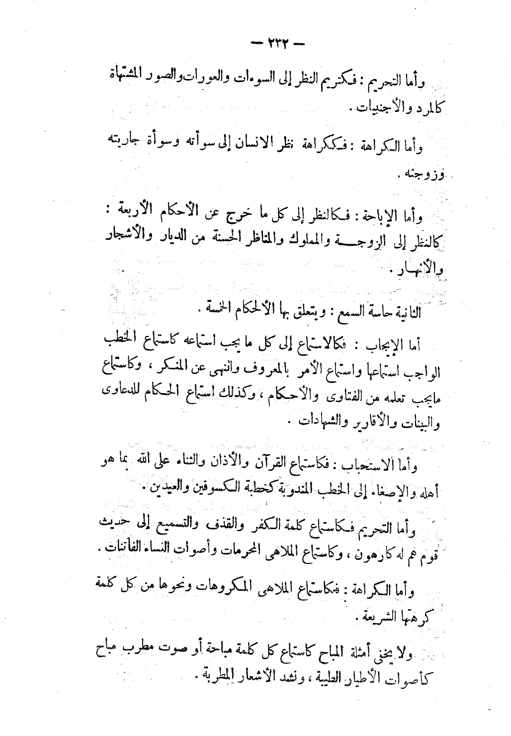الثَّانِيَةُ حَاسَّةُ السَّمْعِ: وَيَتَعَلَّقُ بِهَا الْأَحْكَامُ الْخَمْسَةُ.