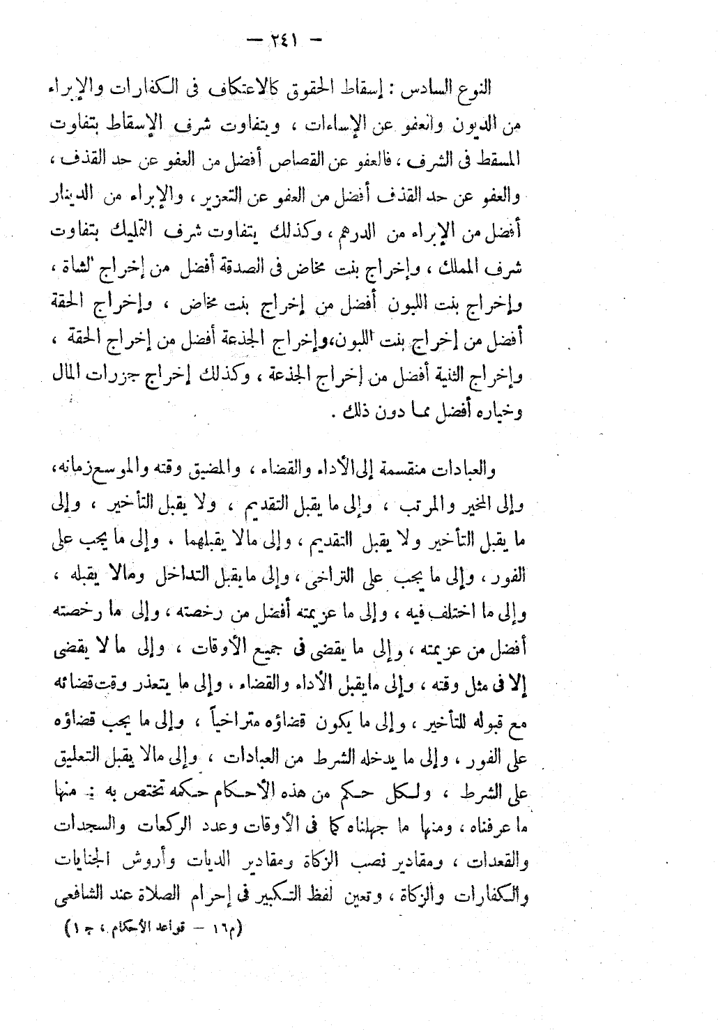 النَّوْعُ السَّادِسُ: إسْقَاطُ الْحُقُوقِ كَالِاعْتِكَافِ فِي الْكَفَّارَاتِ وَالْإِبْرَاءِ مِنْ الدُّيُونِ وَالْعَفْوِ عَنْ الْإِسَاءَاتِ، وَيَتَفَاوَتُ شَرَفُ الْإِسْقَاطِ بِتَفَاوُتِ الْمُسْقِطِ فِي الشَّرَفِ، فَالْعَفْوُ عَنْ الْقِصَاصِ أَفْضَلُ مِنْ الْعَفْوِ عَنْ حَدِّ الْقَذْفِ، وَالْعَفْوُ عَنْ حَدِّ الْقَذْفِ أَفْضَلُ مِنْ الْعَفْوِ عَنْ التَّعْذِيرِ، وَالْإِبْرَاءُ مِنْ الدِّينَارِ أَفْضَلُ مِنْ الْإِبْرَاءِ مِنْ الدِّرْهَمِ.