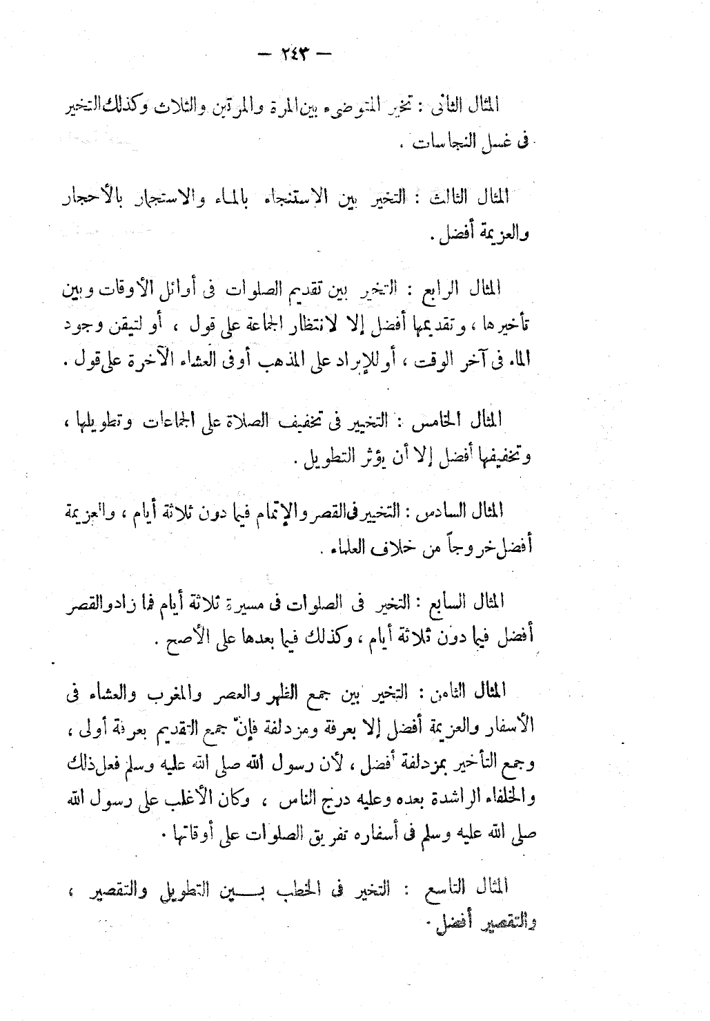 الْمِثَالُ السَّابِعُ: التَّخَيُّرُ فِي الصَّلَوَاتِ فِي مَسِيرَةِ ثَلَاثَةِ أَيَّامٍ فَمَا زَادَ وَالْقَصْرُ أَفْضَلُ فِيمَا دُونَ ثَلَاثَةِ أَيَّامٍ، وَكَذَلِكَ فِيمَا بَعْدَهَا عَلَى الْأَصَحِّ.