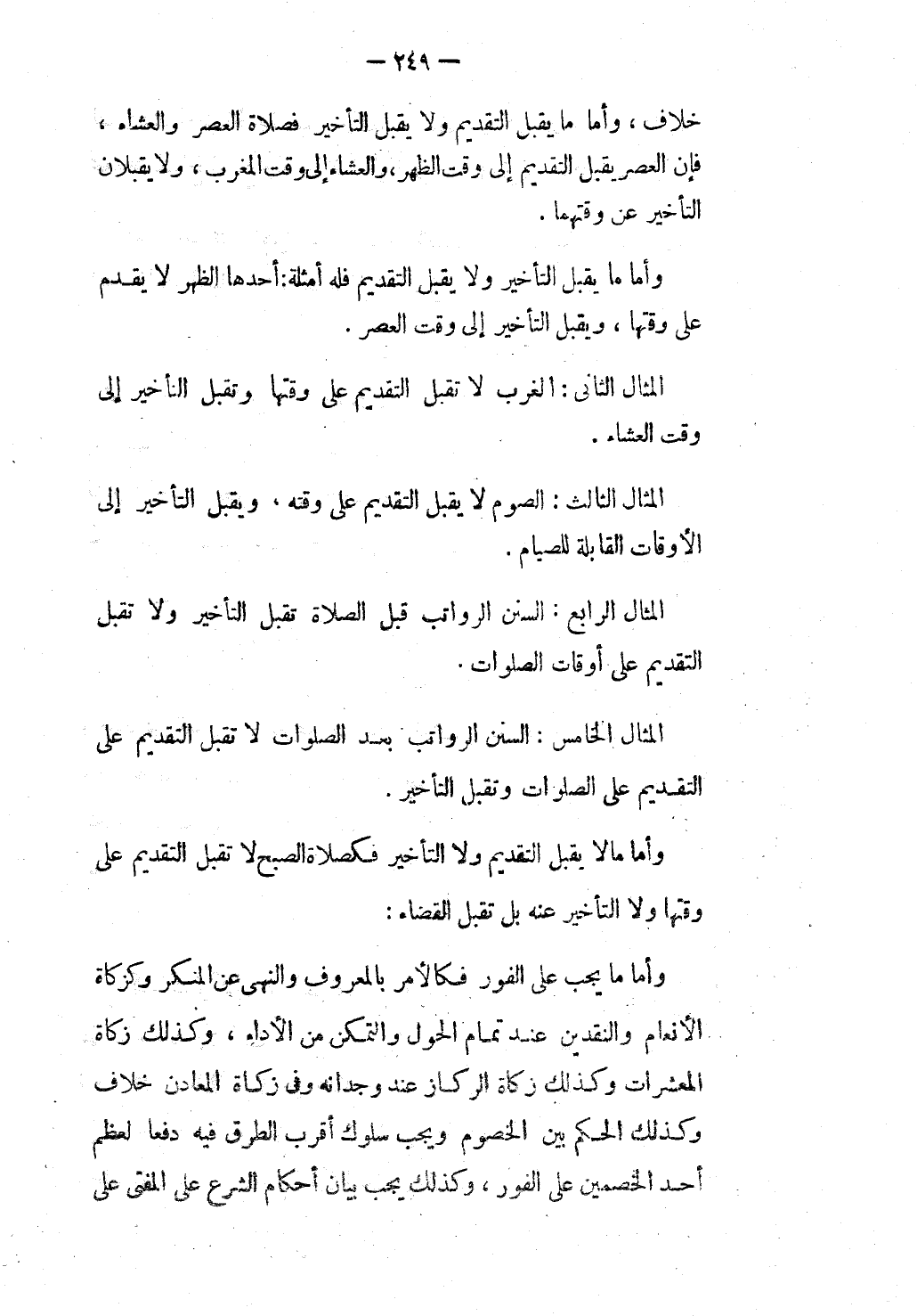 وَأَمَّا مَا لَا يَقْبَلُ التَّقْدِيمَ وَلَا التَّأْخِيرَ فَكَصَلَاةِ الصُّبْحِ لَا تَقْبَلُ التَّقْدِيمَ عَلَى وَقْتِهَا وَلَا التَّأْخِيرَ عَنْهُ بَلْ تَقْبَلُ الْقَضَاءَ.