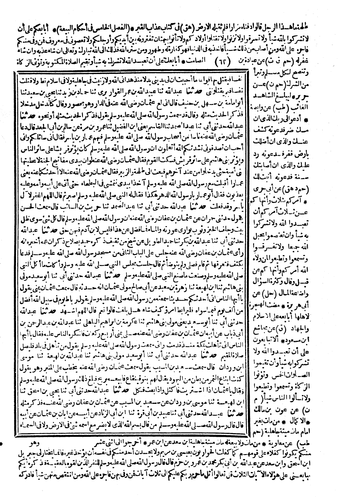 440- حَدَّثَنَا عَبْدُ الصَّمَدِ ، حَدَّثَنَا حُرَيْثُ بْنُ السَّائِبِ ، قَالَ : سَمِعْتُ الْحَسَنَ ، يَقُولُ : حَدَّثَنِي حُمْرَانُ ، عَنْ عُثْمَانَ بْنِ عَفَّانَ ، أَنَّ رَسُولَ اللهِ صَلَّى اللَّهُ عَلَيْهِ وَسَلَّمَ قَالَ : كُلُّ شَيْءٍ سِوَى ظِلِّ بَيْتٍ ، وَجِلْفِ الْخُبْزِ ، وَثَوْبٍ يُوَارِي عَوْرَتَهُ ، وَالْمَاءِ فَمَا فَضَلَ عَنْ هَذَا فَلَيْسَ لاِبْنِ آدَمَ فِيهِ حَقٌّ.