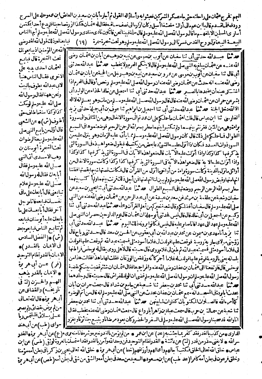 499- حَدَّثَنَا إِسْمَاعِيلُ بْنُ إِبْرَاهِيمَ ، حَدَّثَنَا عَوْفُ بْنُ أَبِي جَمِيلَةَ ، حَدَّثَنِي يَزِيدُ الْفَارِسِيُّ ، حَدَّثَنَا ابْنُ عَبَّاسٍ ، قَالَ : قُلْتُ لِعُثْمَانَ : مَا حَمَلَكُمْ عَلَى أَنْ عَمَدْتُمْ إِلَى الأَنْفَالِ وَهِيَ مِنَ الْمَثَانِي ، وَإِلَى بَرَاءَةٌ وَهِيَ مِنَ الْمِئِينَ ، فَقَرَنْتُمْ بَيْنَهُمَا وَلَمْ تَكْتُبُوا بَيْنَهُمَا سَطْرَ بِسْمِ اللهِ الرَّحْمَنِ الرَّحِيمِ ، فَوَضَعْتُمُوهَا فِي السَّبْعِ الطِّوَالِ ، فَمَا حَمَلَكُمْ عَلَى ذَلِكَ ؟ قَالَ : كَانَ رَسُولُ اللهِ صَلَّى اللَّهُ عَلَيْهِ وَسَلَّمَ مِمَّا يَأْتِي عَلَيْهِ الزَّمَانُ وَهُوَ يُنْزَلُ عَلَيْهِ مِنَ السُّوَرِ ذَوَاتِ الْعَدَدِ ، فَكَانَ إِذَا نْزِلَ عَلَيْهِ الشَّيْءُ دَعَا بَعْضَ مَنْ يَكْتُبُ لَهُ فَيَقُولُ : ضَعُوا هَذِهِ فِي السُّورَةِ الَّتِي يُذْكَرُ فِيهَا كَذَا وَكَذَا وَإِذَا أُنْزِلَتْ عَلَيْهِ الآيَاتُ قَالَ : ضَعُوا هَذِهِ الآيَاتِ فِي السُّورَةِ الَّتِي يُذْكَرُ فِيهَا كَذَا وَكَذَا وَإِذَا أُنْزِلَتْ عَلَيْهِ الآيَةُ ، قَالَ : ضَعُوا هَذِهِ الآيَةَ فِي السُّورَةِ الَّتِي يُذْكَرُ فِيهَا كَذَا وَكَذَا قَالَ : وَكَانَتِ الأَنْفَالُ مِنْ أَوَائِلِ مَا نَزَلَ بِالْمَدِينَةِ ، وَكَانَتْ بَرَاءَةُ مِنْ آخِرِ مَا أُنْزِلَ مِنَ الْقُرْآنِ ، قَالَ : فَكَانَتْ قِصَّتُهَا شَبِيهًا بِقِصَّتِهَا ، فَظَنَنَّا أَنَّهَا مِنْهَا ، وَقُبِضَ رَسُولُ اللهِ صَلَّى اللَّهُ عَلَيْهِ وَسَلَّمَ وَلَمْ يُبَيِّنْ لَنَا أَنَّهَا مِنْهَا ، فَمِنْ أَجْلِ ذَلِكَ قَرَنْتُ بَيْنَهُمَا ، وَلَمْ أَكْتُبْ بَيْنَهُمَا سَطْرًا : بِسْمِ اللهِ الرَّحْمَنِ الرَّحِيمِ ، وَوَضَعْتُهَا فِي السَّبْعِ الطِّوَالِ.