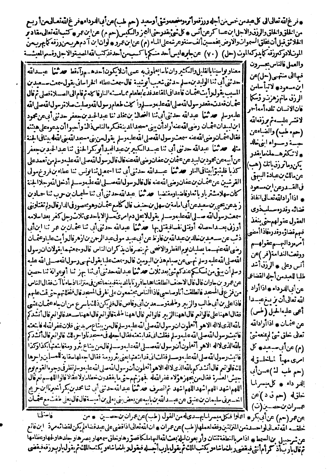 511- حَدَّثَنَا بَهْزٌ ، حَدَّثَنَا أَبُو عَوَانَةَ ، حَدَّثَنَا حُصَيْنٌ ، عَنْ عَمْرِو بْنِ جَاوَانَ ، قَالَ : قَالَ الأَحْنَفُ : انْطَلَقْنَا حُجَّاجًا فَمَرَرْنَا بِالْمَدِينَةِ ، فَبَيْنَمَا نَحْنُ فِي مَنْزِلِنَا إِذْ جَاءَنَا آتٍ فَقَالَ النَّاسُ : مِنْ فَزَعٍ فِي الْمَسْجِدِ ، فَانْطَلَقْتُ أَنَا وَصَاحِبِي ، فَإِذَا النَّاسُ مُجْتَمِعُونَ عَلَى نَفَرٍ فِي الْمَسْجِدِ ، قَالَ : فَتَخَلَّلْتُهُمْ حَتَّى قُمْتُ عَلَيْهِمْ ، فَإِذَا عَلِيُّ بْنُ أَبِي طَالِبٍ ، وَالزُّبَيْرُ ، وَطَلْحَةُ ، وَسَعْدُ بْنُ أَبِي وَقَّاصٍ ، قَالَ : فَلَمْ يَكُنْ ذَلِكَ بِأَسْرَعَ مِنْ أَنْ جَاءَ عُثْمَانُ يَمْشِي فَقَالَ : أَهَاهُنَا عَلِيٌّ ؟ قَالُوا : نَعَمْ ، قَالَ : أَهَاهُنَا الزُّبَيْرُ ؟ قَالُوا : نَعَمْ ، قَالَ : أَهَاهُنَا طَلْحَةُ ؟ قَالُوا : نَعَمْ ، قَالَ : أَهَاهُنَا سَعْدٌ ؟ قَالُوا : نَعَمْ ، قَالَ : أَنْشُدُكُمْ بِاللَّهِ الَّذِي لاَ إِلَهَ إِلاَّ هُوَ ، أَتَعْلَمُونَ أَنَّ رَسُولَ اللهِ صَلَّى اللَّهُ عَلَيْهِ وَسَلَّمَ قَالَ : مَنْ يَبْتَاعُ مِرْبَدَ بَنِي فُلانٍ غَفَرَ اللَّهُ لَهُ فَابْتَعْتُهُ ، فَأَتَيْتُ رَسُولَ اللهِ صَلَّى اللَّهُ عَلَيْهِ وَسَلَّمَ ، فَقُلْتُ : إِنِّي قَدِ ابْتَعْتُهُ ، فَقَالَ : اجْعَلْهُ فِي مَسْجِدِنَا وَأَجْرُهُ لَكَ ؟ قَالُوا : نَعَمْ ، قَالَ : أَنْشُدُكُمْ بِاللَّهِ الَّذِي لاَ إِلَهَ إِلاَّ هُوَ أَتَعْلَمُونَ أَنَّ رَسُولَ اللهِ صَلَّى اللَّهُ عَلَيْهِ وَسَلَّمَ قَالَ : مَنْ يَبْتَاعُ بِئْرَ رُومَةَ ؟ فَابْتَعْتُهَا بِكَذَا وَكَذَا ، فَأَتَيْتُ رَسُولَ اللهِ صَلَّى اللَّهُ عَلَيْهِ وَسَلَّمَ فَقُلْتُ : إِنِّي قَدِ ابْتَعْتُهَا - يَعْنِي بِئْرَ رُومَةَ - فَقَالَ : اجْعَلْهَا سِقَايَةً لِلْمُسْلِمِينَ وَأَجْرُهَا لَكَ ؟ قَالُوا : نَعَمْ ، قَالَ : أَنْشُدُكُمْ بِاللَّهِ الَّذِي لاَ إِلَهَ إِلاَّ هُوَ ، أَتَعْلَمُونَ أَنَّ رَسُولَ اللهِ صَلَّى اللَّهُ عَلَيْهِ وَسَلَّمَ نَظَرَ فِي وُجُوهِ الْقَوْمِ يَوْمَ جَيْشِ الْعُسْرَةِ ، فَقَالَ : مَنْ يُجَهِّزُ هَؤُلاءِ غَفَرَ اللَّهُ لَهُ فَجَهَّزْتُهُمْ حَتَّى مَا يَفْقِدُونَ خِطَامًا وَلا عِقَالاً ، قَالُوا : اللَّهُمَّ نَعَمْ ، قَالَ : اللَّهُمَّ اشْهَدْ ، اللَّهُمَّ اشْهَدْ ، اللَّهُمَّ اشْهَدْ ثُمَّ انْصَرَفَ.