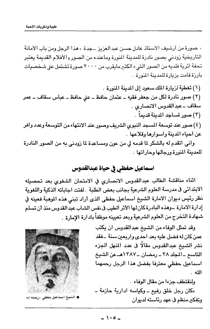 واني اتقدم له بالشكر لما قدمه لي من عون ومساعدة لما زودني به من الصور النادرة للمدينة المنورة ورجالها وحاراتها.