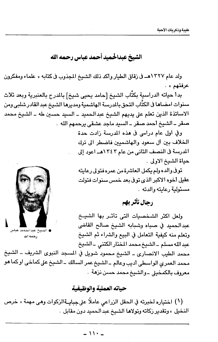 (1) اختياره في الحقل الزراعي عاملاً على جباية الزكوات وهي مهمة ((خرص النخيل)) وتقدير زكاته وتولاها الشيخ عبد الحميد دون مقابل.