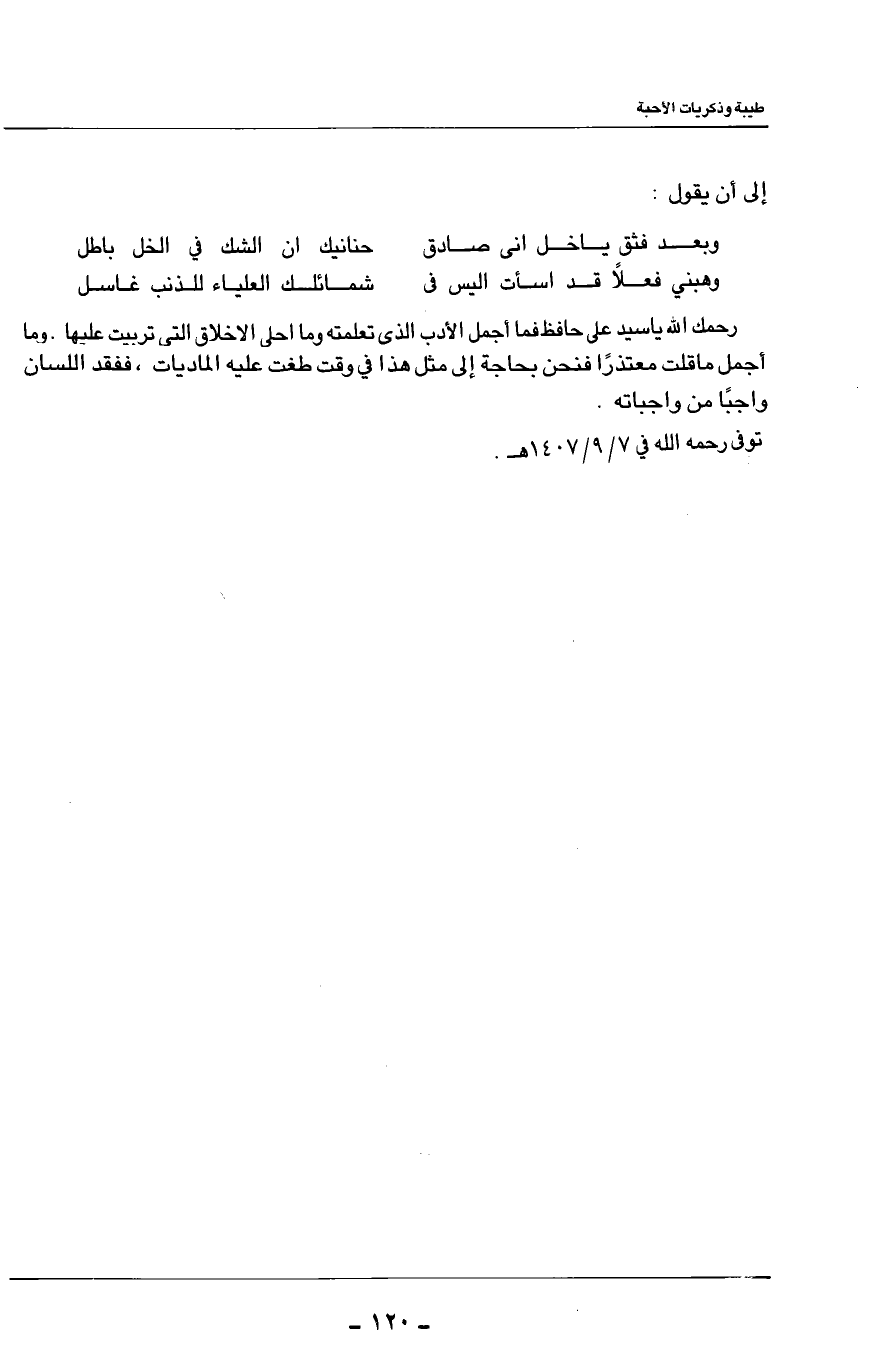 رحمك الله يا سيد علي حافظ فما أجمل الأدب الذي تعلمته وما احلى الاخلاق التي تربيت عليها وما أجمل ما قلت معتذراً فنحن بحاجة إلى مثل هذا في وقت طغت عليه الماديات، ففقد اللسان واجباً من واجباته.