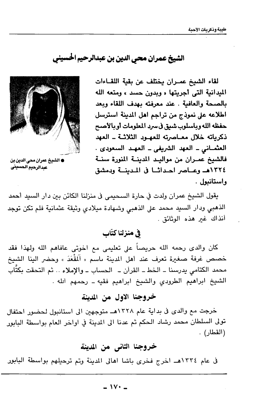 عند معرفته بهدف اللقاء وبعد أطلاعه على نموذج من تراجم أهل المدينة استرسل حفظه الله وباسلوب شيق في سرد المعلومات أو بالاصح ذكرياته خلال معاصرته للعهود الثلاثة - العهد العثماني - العهد الشريفي - العهد السعودي.