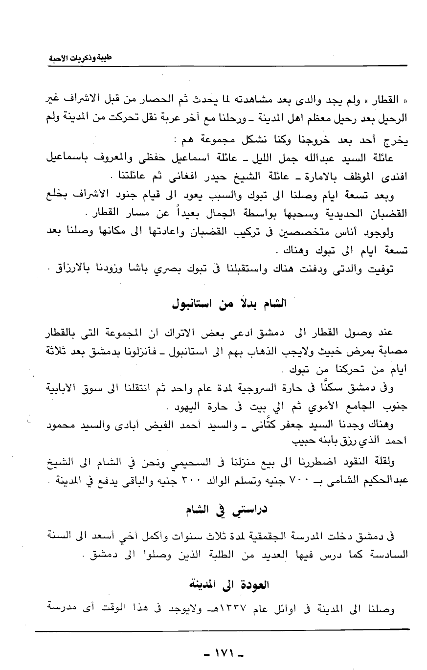 ((القطار)) ولم يجد والدي بعد مشاهدته لما يحدث ثم الحصار من قبل الاشراف غير الرحيل بعد رحيل معظم اهل المدينة - ورحلنا مع آخر عربة نقل تحركت من المدينة ولم يخرج أحد بعد خروجنا وكنا نشكل مجموعة هم: