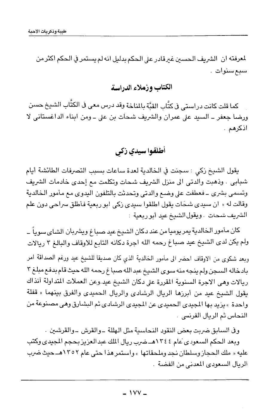 وذهبت والدتي إلى منزل الشريف شحات وتكلمت مع إحدى خادمات الشريف وتسمى بشرى - فعطفت على وضع والدتي وتحدثت بالتلفون اليدوي مع مأمور الخالدية ((وقالت له)) ان سيدي شحات يقول اطلقوا سيدي زكي أبو ربيعة فاطلق سراحي دون علم الشريف شحات.