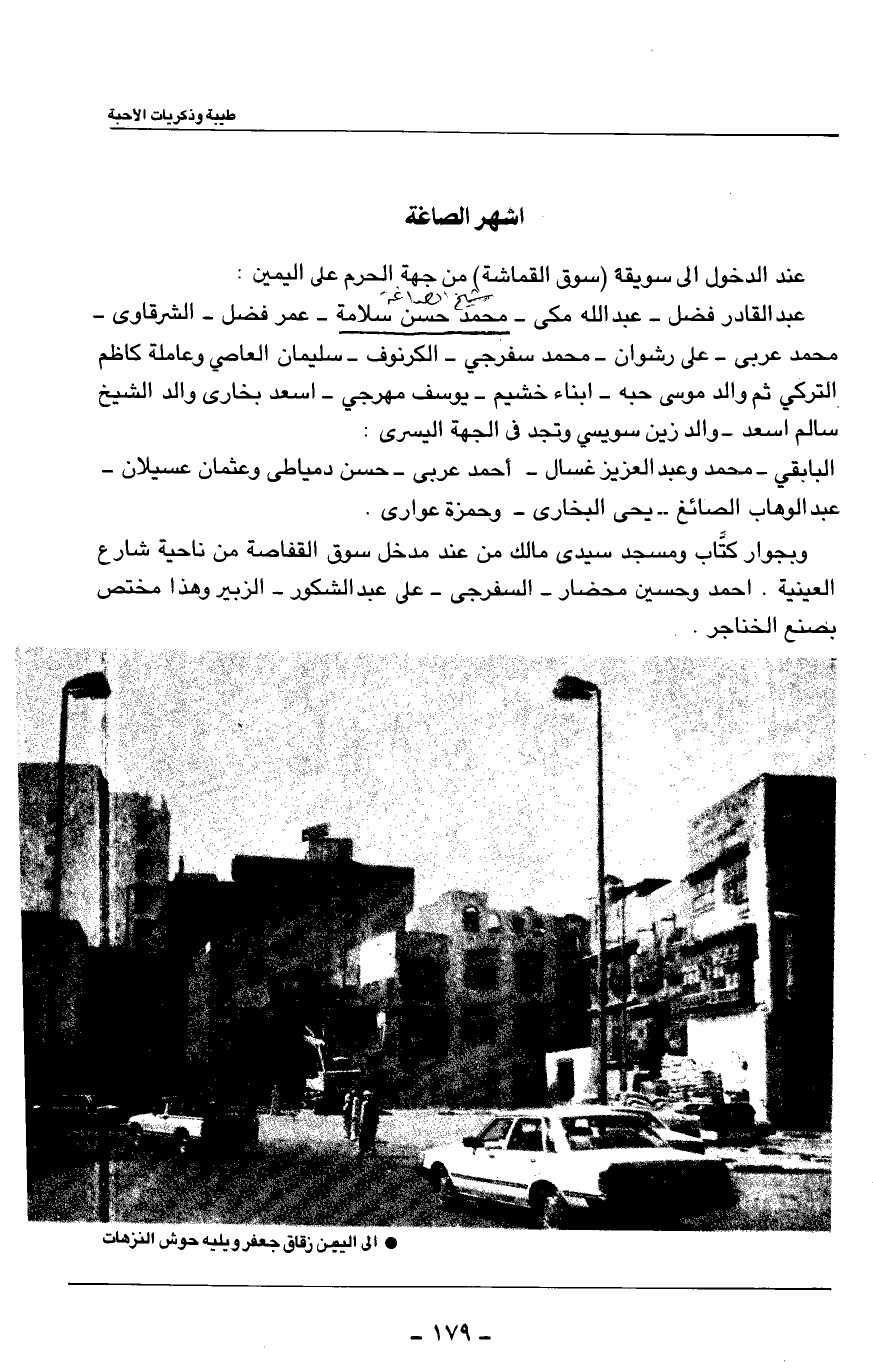 عبد القادر فضل - عبد الله مكي - محمد حسن سلامة - عمر فضل - الشرقاوي - محمد عربي - علي رشوان - محمد سفرجي - الكرنوف - سليمان العاصي وعاملة كاظم التركي ثم والد موسى حبه - ابناء خشيم - يوسف مهرجي - أسعد بخاري والد الشيخ سالم أسعد - والد زين سويسي وتجد في الجهة اليسرى: