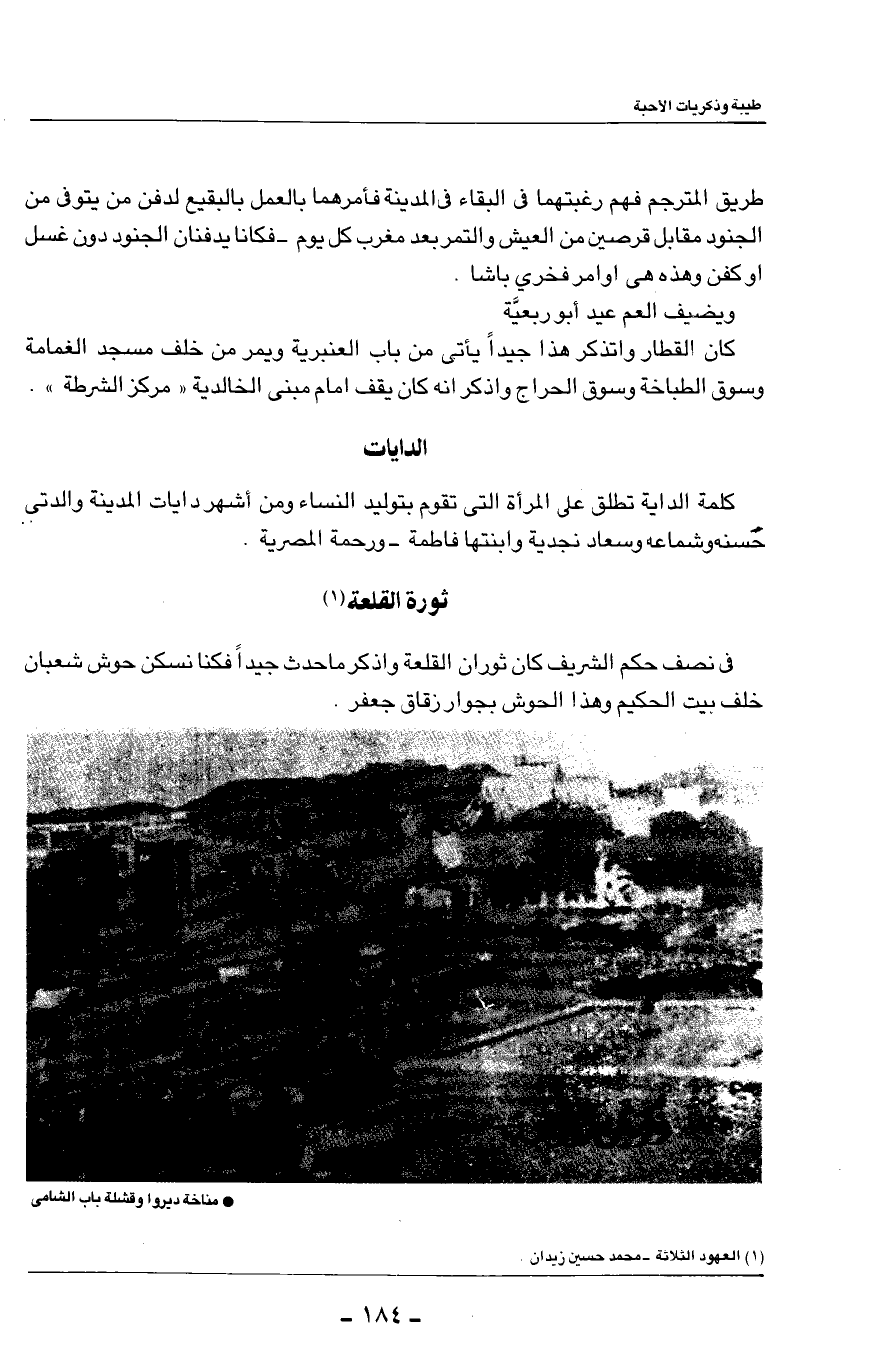 (1) في نصف حكم الشريف كان ثوران القلعة واذكر ما حدث جيداً فكنا نسكن حوش شعبان خلف بيت الحكيم وهذا الحوش بجوار زقاق جعفر.