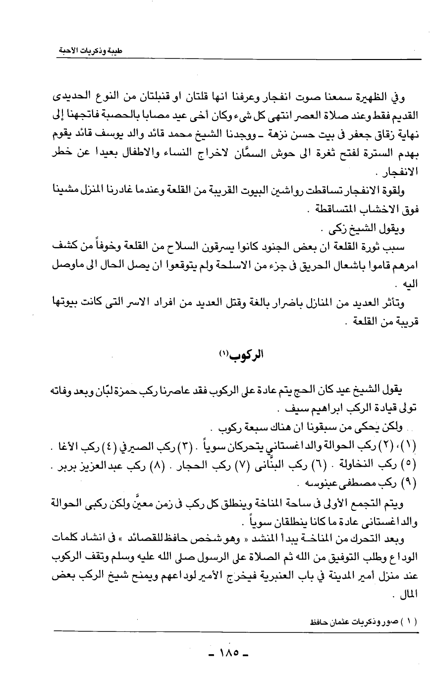 وفي الظهيرة سمعنا صوت انفجار وعرفنا انها قلتان اوقنبلتان من النوع الحديدي القديم فقط وعند صلاة العصر انتهى كل شيء وكان أخي عيد مصابا بالحصبة فاتجهنا إلى نهاية زقاق جعفر في بيت حسن نزهة - ووجدنا الشيخ محمد قائد والد يوسف قائد يقوم بهدم السترة لفتح ثغرة إلى حوش السمَّان لاخراج النساء والاطفال بعيدا عن خطر الانفجار.