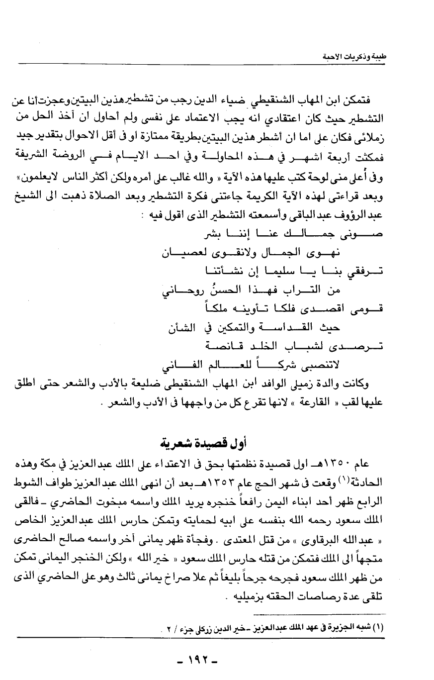 فتمكن ابن المهاب الشنقيطي ضياء الدين رجب من تشطير هذين البيتين وعجزت أنا عن التشطير حيث كان اعتقادي انه يجب الاعتماد على نفسي ولم أحاول ان آخذ الحل من زملائي فكان على ان أشطر هذين البيتين بطريقة ممتازة او في أقل الاحوال بتقدير جيد فمكثت أربعة أشهر في هذه المحاولة وفي احد الايام في الروضة الشريفة وفي أعلى مني لوحة كتب عليها هذه الآية ((والله غالب على امره ولكن أكثر الناس لا يعلمون)) وبعد قراءتي لهذه الآية الكريمة جاءتني فكرة التشطير وبعد الصلاة ذهبت إلى الشيخ عبد الرؤوف عبد الباقي وأسمعته التشطير الذي اقول فيه: