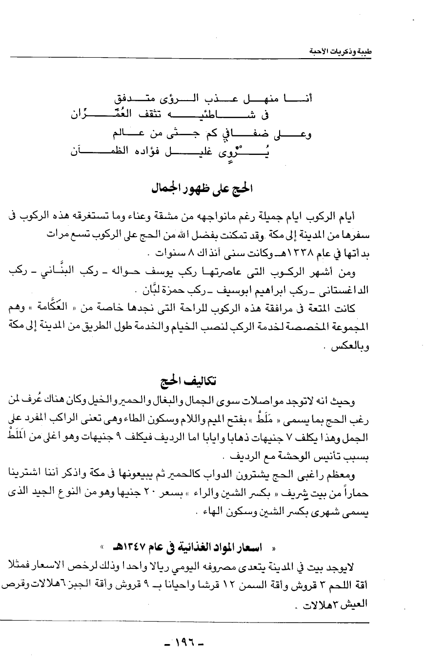 أيام الركوب ايام جميلة رغم ما نواجهه من مشقة وعناء وما تستغرقه هذه الركوب في سفرها من المدينة إلى مكة وقد تمكنت بفضل الله من الحج على الركوب تسع مرات بدأتها في عام 1338هـ وكانت سني آنذاك 8سنوات.