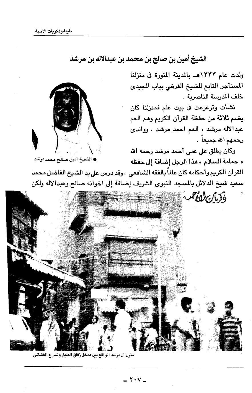 وكان يطلق على عمي أحمد مرشد رحمه الله ((حمامة السلام)) هذا الرجل إضافة إلى حفظة القرآن الكريم وأحكامه كان عالماً بالفقه الشافعي، وقد درس على يد الشيخ الفاضل نحند سعيد شيخ الدلائل بالمسجد النبوي الشريف إضافة إلى اخوانه صالح وعبد الاله ولكن…