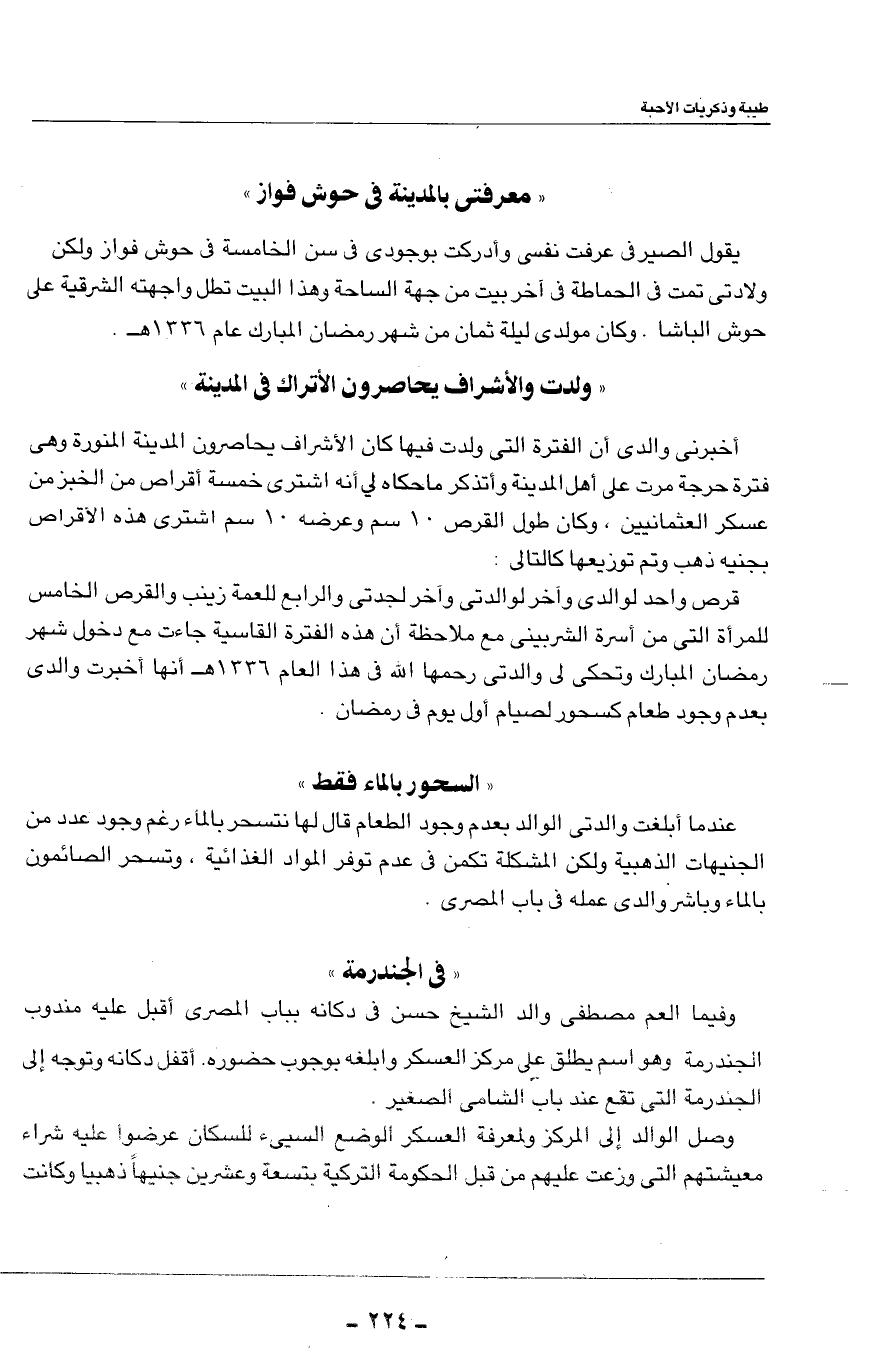 أخبرني والدي أن الفترة التي ولدت فيها كان الأشراف يحاصرون المدينة المنورة وهي فترة حرجة مرت على أهل المدينة وأتذكر ما حكاه لي أنه اشترى خمسة أقراص من الخبز من عسكر العثمانيين، وكان طول القرص 10سم وعرضه 10سم اشترى هذه الأقراص بجنيه ذهب وتم توزيعها كالتالي: