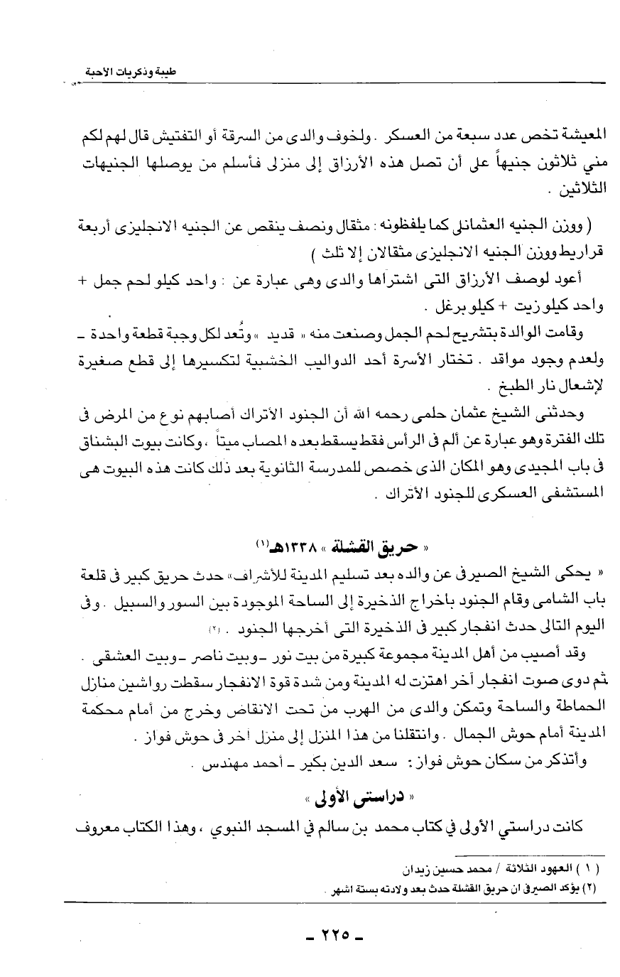 1338هـ (1) ((يحكى الشيخ الصيرفي عن والده بعد تسليم المدينة للأشراف)) حدث حريق كبير في قلعة باب الشامي وقام الجنود باخراج الذخيرة إلى الساحة الموجودة بين السور والسبيل.