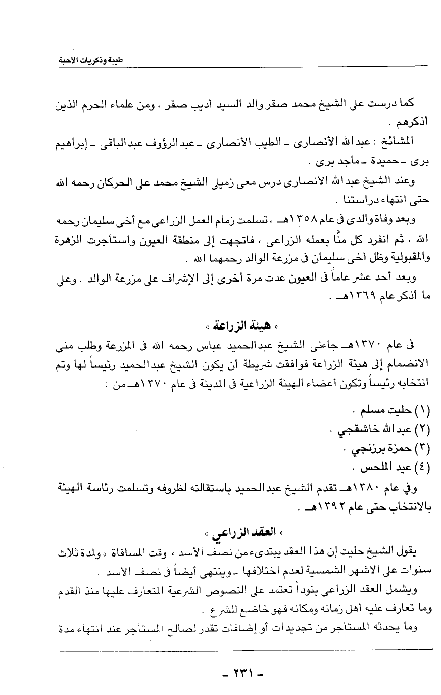 في عام 1370هـ جاءني الشيخ عبد الحميد عباس رحمه الله في المزرعة وطلب مني الانضمام إلى هيئة الزراعة فوافقت شريطة أن يكون الشيخ عبد الحميد رئيساً لها وتم انتخابه رئيساً وتكون أعضاء الهيئة الزراعية في المدينة في عام 1370هـ من: