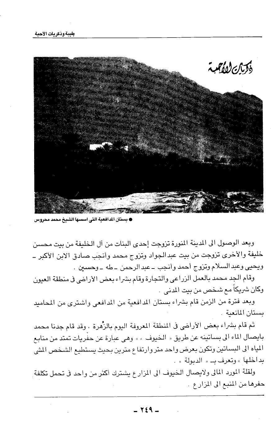 ثم قام بشراء بعض الأراضي في المنطقة المعروفة اليوم بالزُهرة، وقد قام جدنا محمد بإيصال الماء إلى بساتينه عن طريق ((الخيوف)) وهي عبارة عن حفريات تمتد من منابع المياه إلى البساتين وتكون بعرض واحد متر وارتفاع مترين بحيث يستطيع الشخص المشي بداخلها)) وتعرف بـ ((الدبولة)).