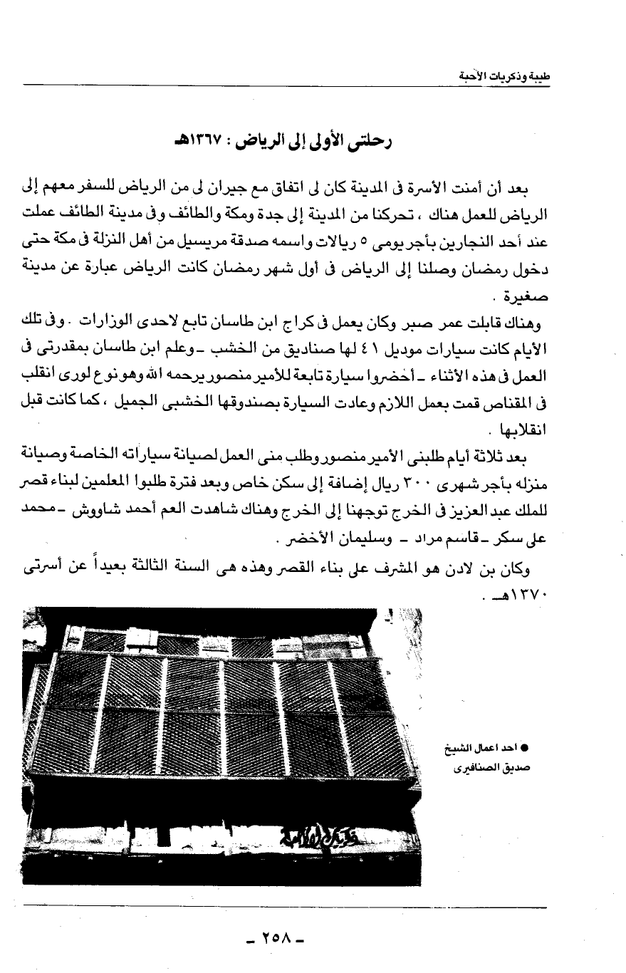 وهناك قابلت عمر صبر وكان يعمل في كراج ابن طاسات تابع لاحدى الوزارات. وفي تلك الأيام في هذه الأثناء - الأيام كانت سيارات موديل 41 لها صناديق من الخشب - ولعم ابن طاسان بمقدرتي في العمل في هذه الأثناء - أحضروا سيارة تابعة للأمير منصور يرحمه الله وهو نوع لوري انقلب في المقناص قمت بعمل الللازم وعادت السيارة بصندوقها الخشبي الجميل، وكما كانت قبل انقلابها.