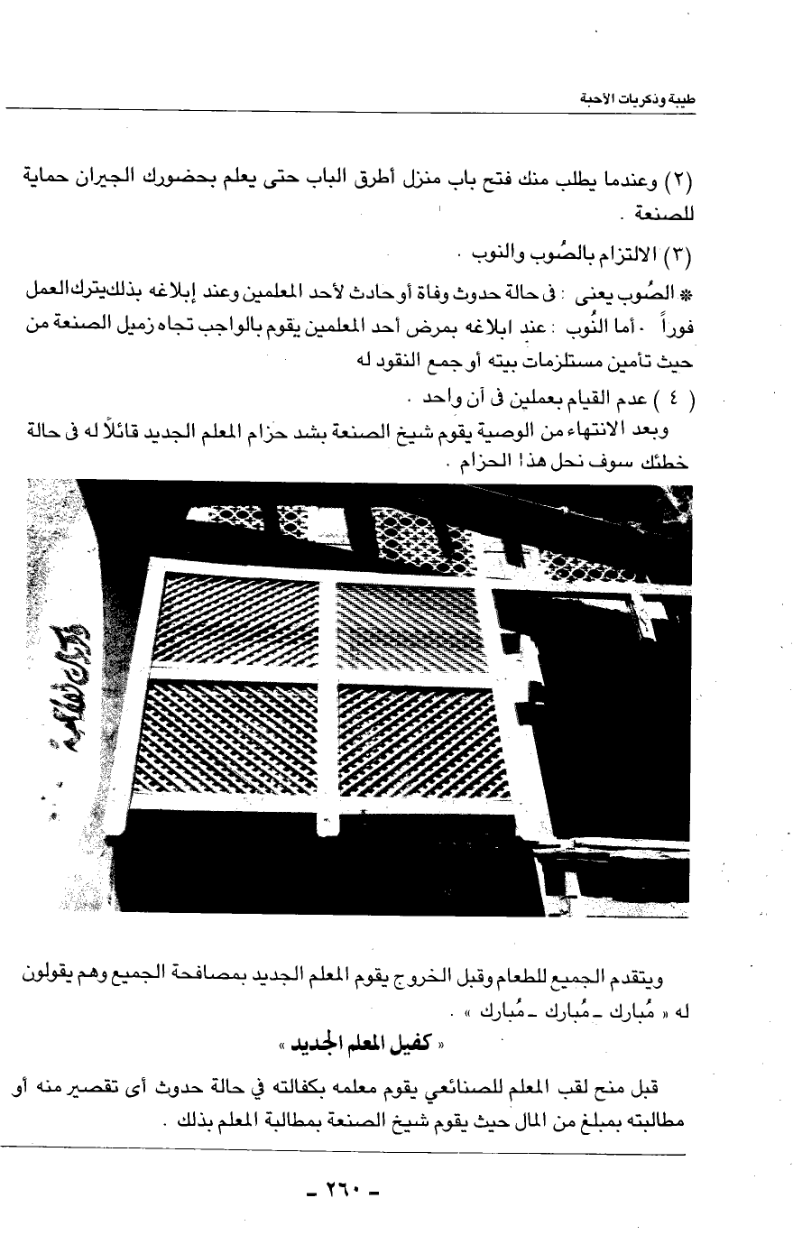 قبل منح لقب المعلم للصنائعي يقوم معلمه بكفالته في حالة حدوث أي تقصير منه أو مطالبته بمبلغ من المال حيث يقوم شيخ الصنعة بمطالبة المعلم بذلك.