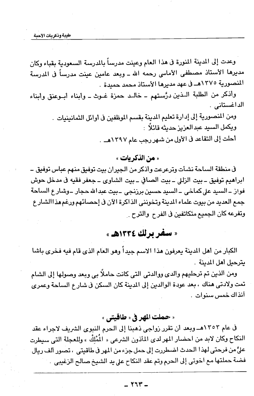 في عام 1353هـ وبعد أن تقرر زواجي ذهبنا إلى الحرم النبوي الشريف لاجراء عقد النكاح وكان لابد من احضار المهر لدى المأذون الشرعي ((المُلكْ)) وللعجلة التي سيطرت عليَّ من فرحتي لهذا الحدث اضطررت إلى حمل جزء من المهر في طاقيتي، تصور ألف ريال فضة حملتها مع اخوتي إلى الحرم وتم عقد النكاح على يد الشيخ صالح الزغيبي.